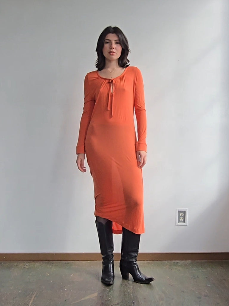 APC orange lightweight longsleeve maxi dress with tied keyhole opening at the neckline. There is a very small repaired hole on the left shoulder and underarm but otherwise in good condition. Marked size S.