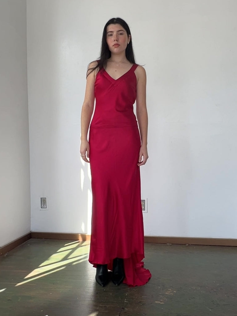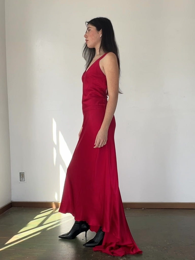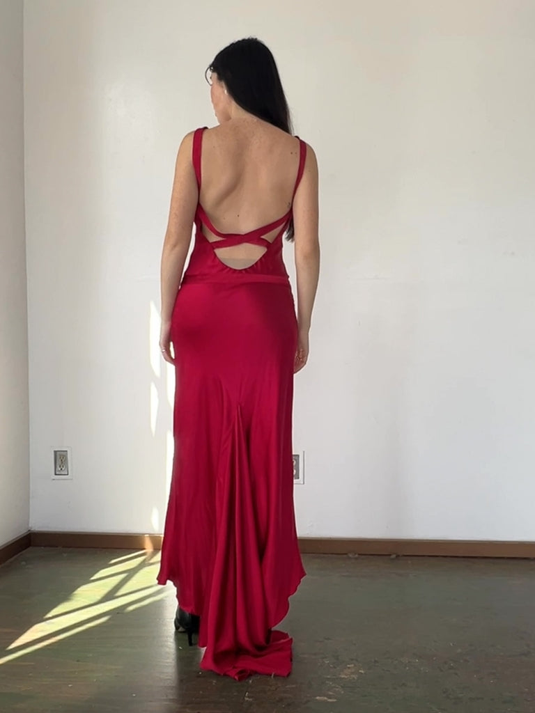 Cherry red silk drop-waist maxi dress with a v-neck, strappy open back, and a flowy hemline with a slight train. In great condition.