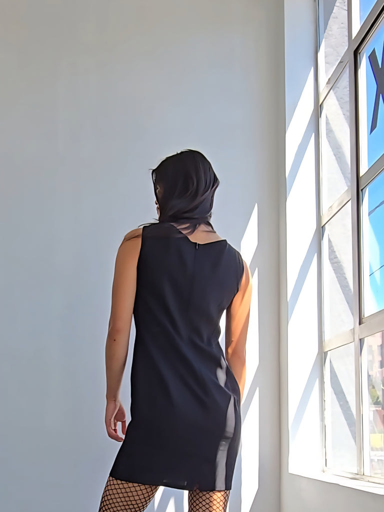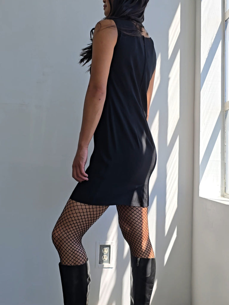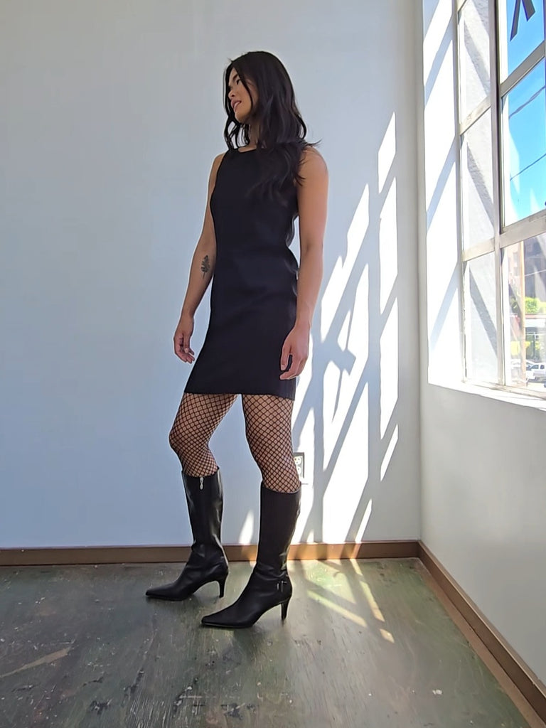Classic Italian-made vintage 90's sleeveless, knee-length little black dress with subtle pinstripe pattern. Zips up the back. In great condition. Marked size 44.