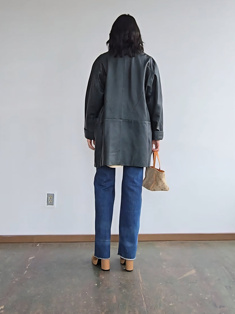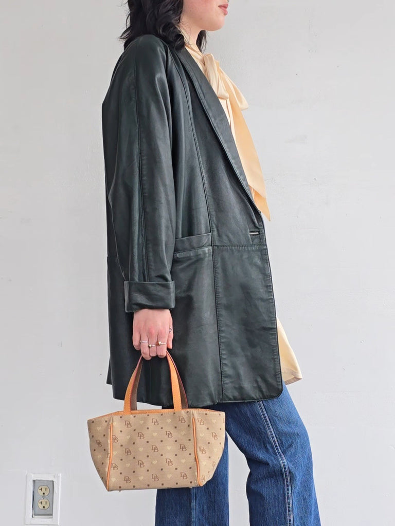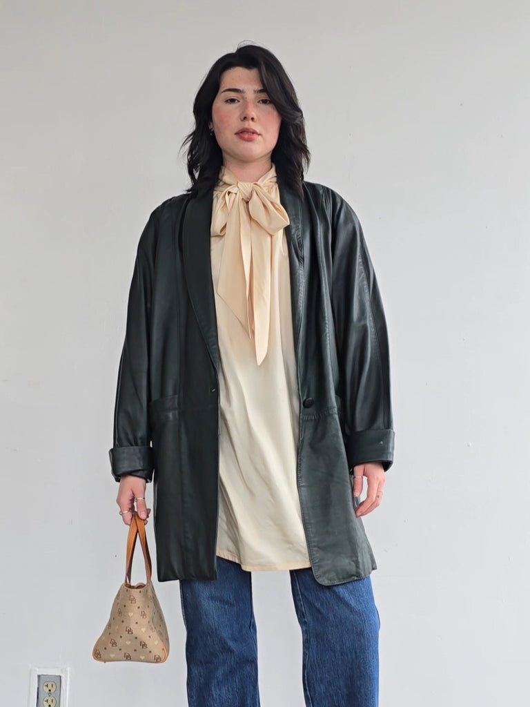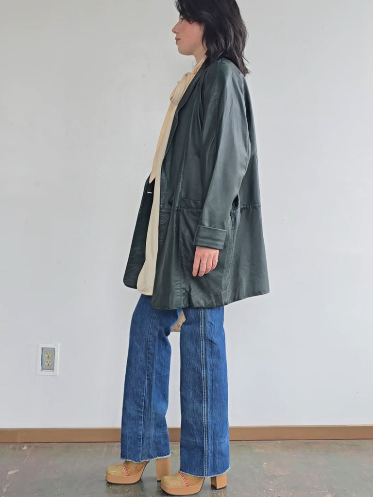 Vintage early 1990s forest green leather slouchy coat with large front pockets, cuffed sleeves, and single button closure. Excellent condition for age. No marked size