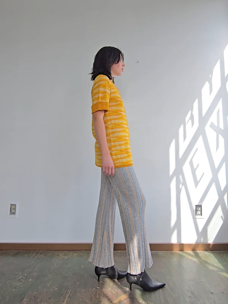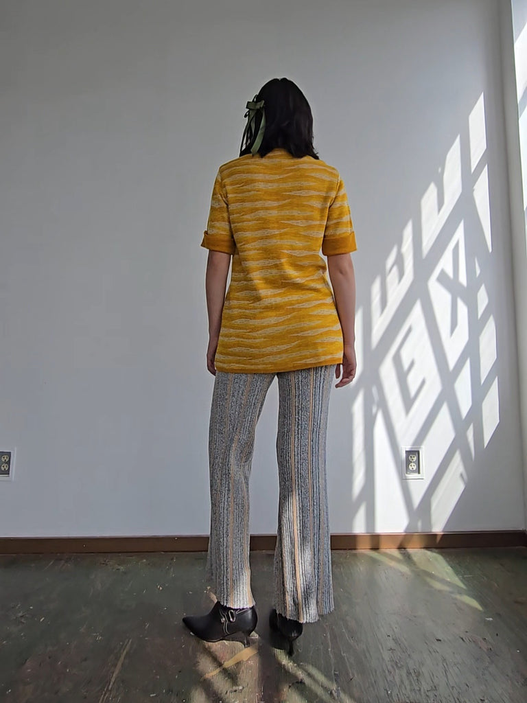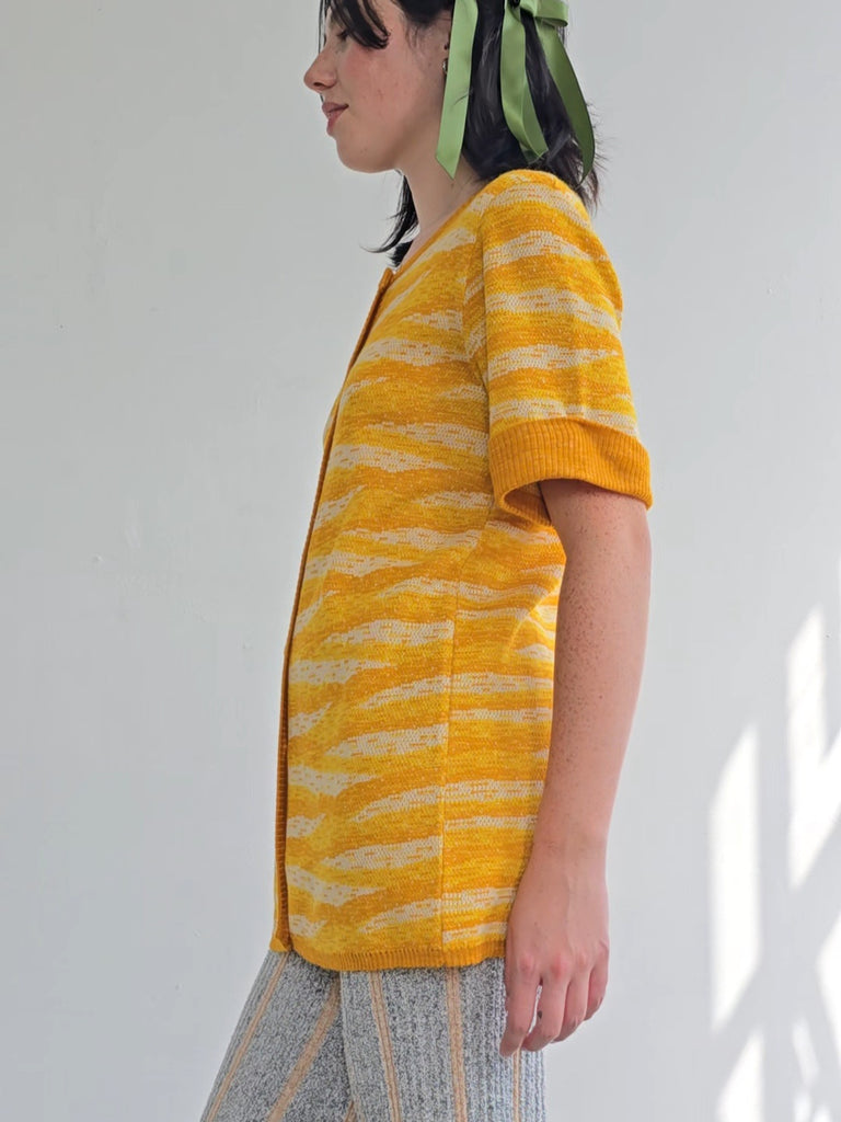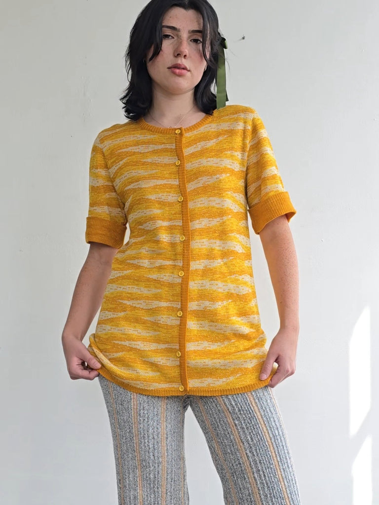 Vintage Givenchy knit sweater in shades of yellow. Sleeves are short with ribbed cuffs. Closes with small yellow buttons down the front. In great condition. Marked size 4.