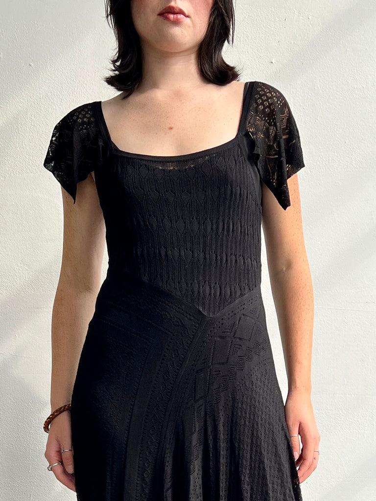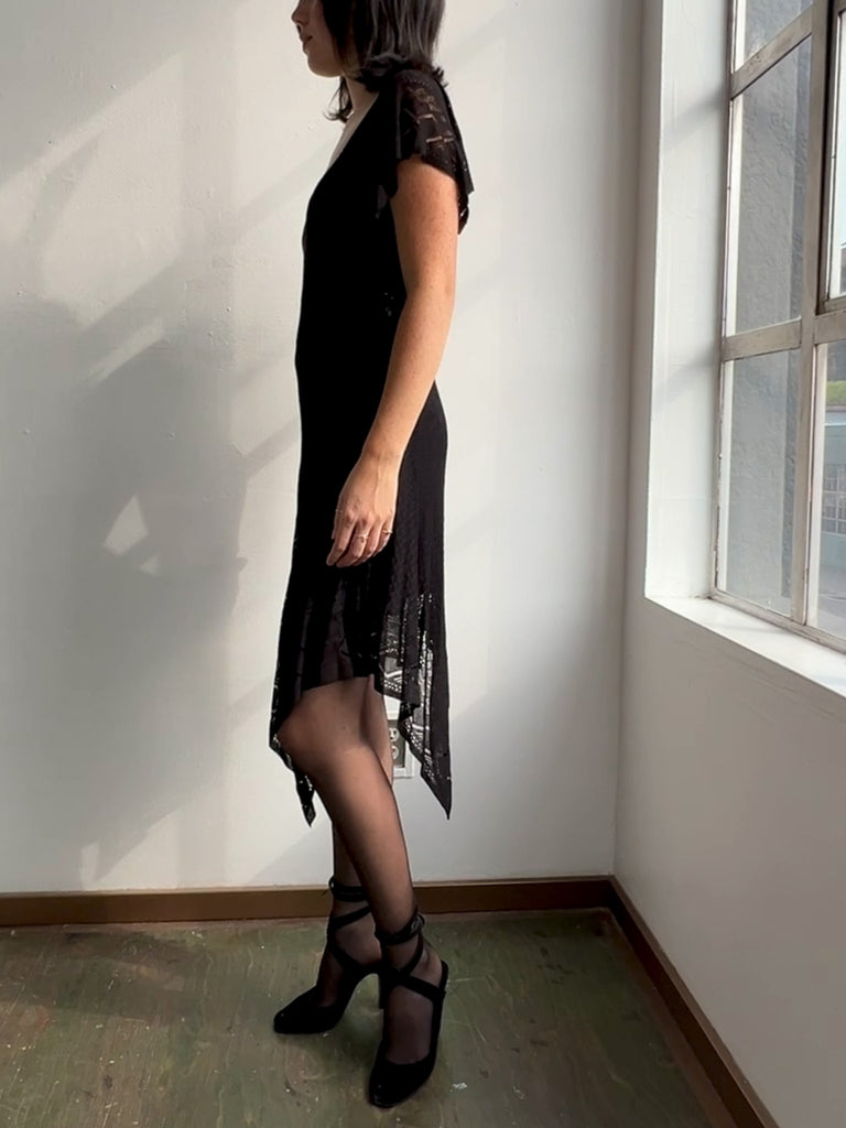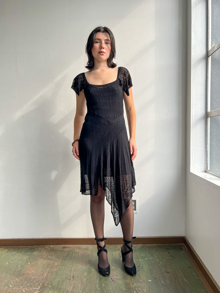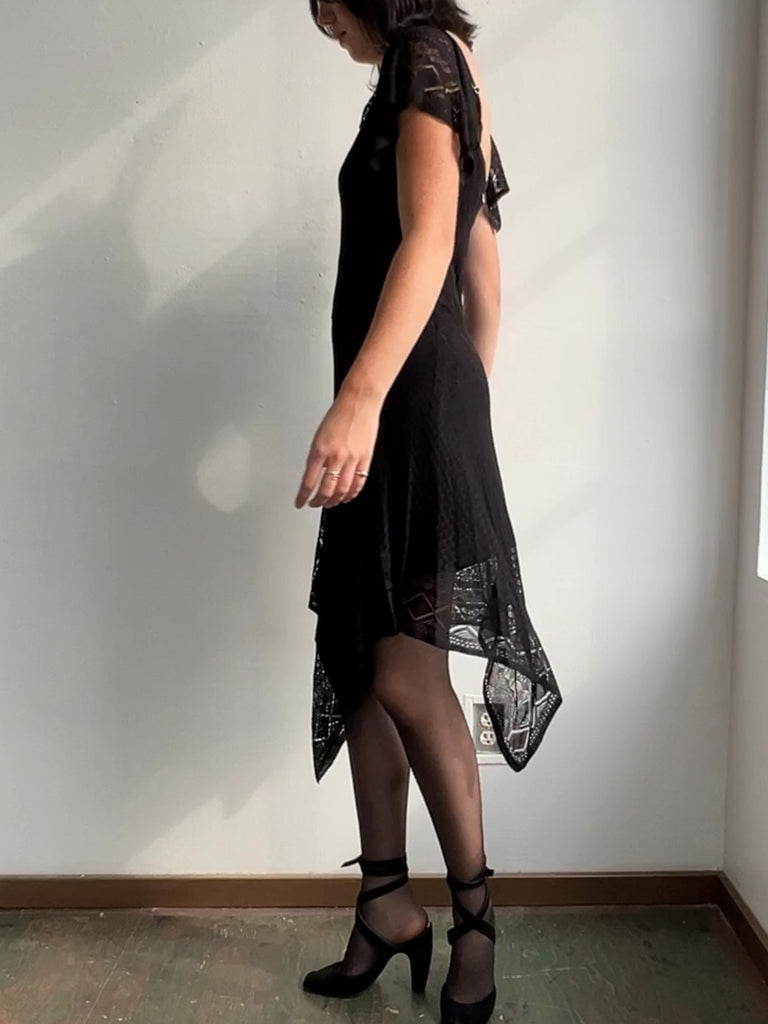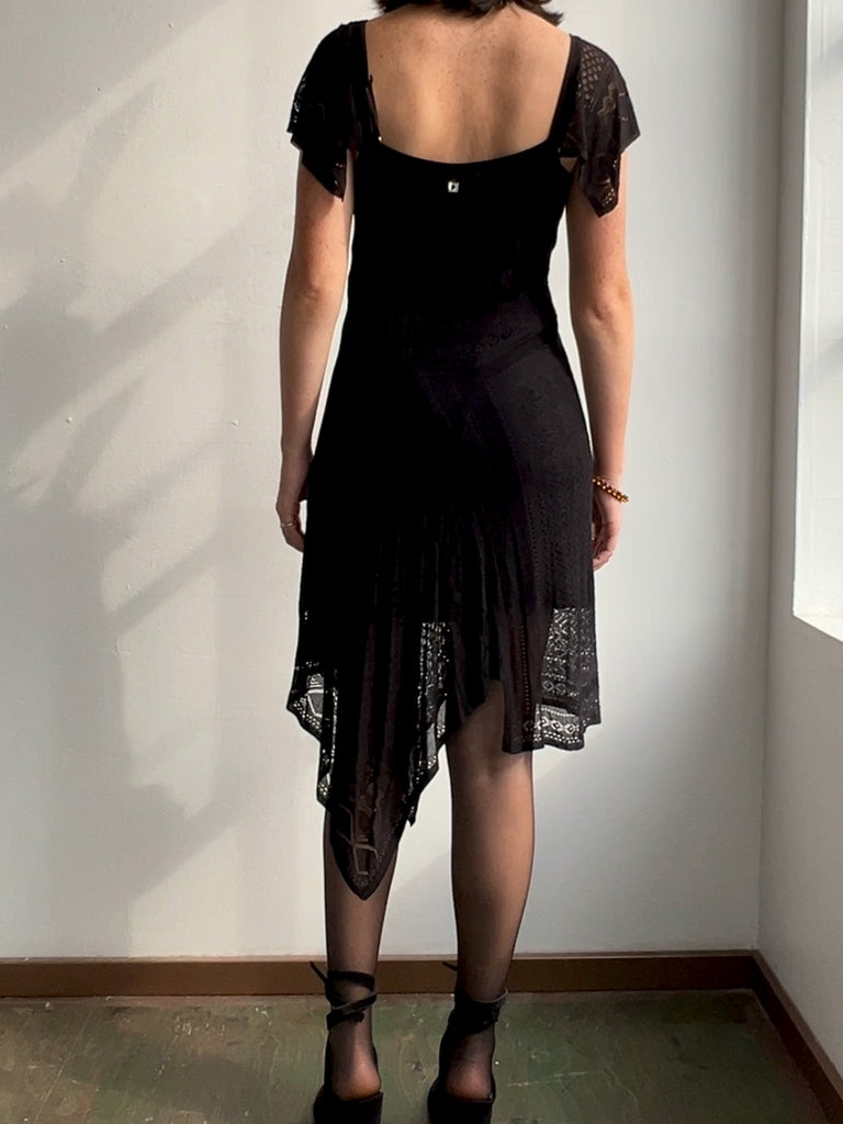 Black stretchy mesh lace dress with short flowy sleeves and an asymmetrical hem from Italian label Twin-Set. Includes a black slip. In great condition.
