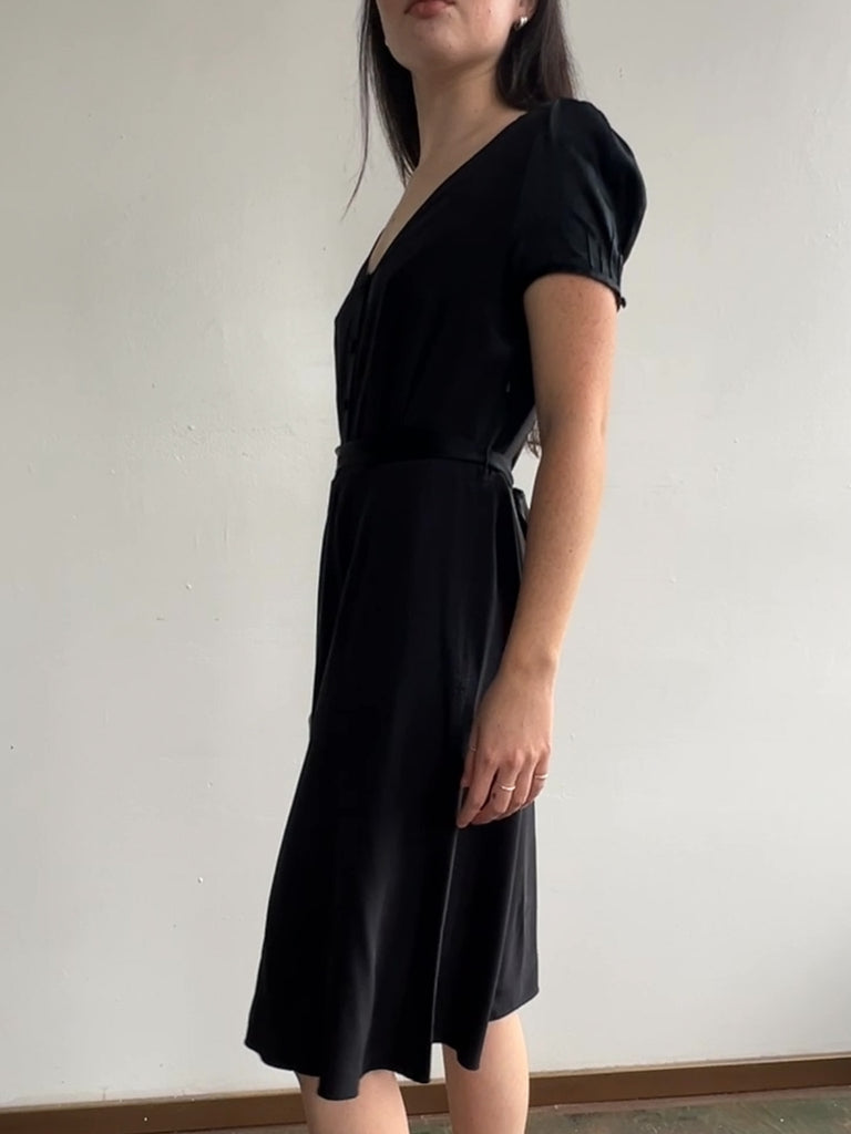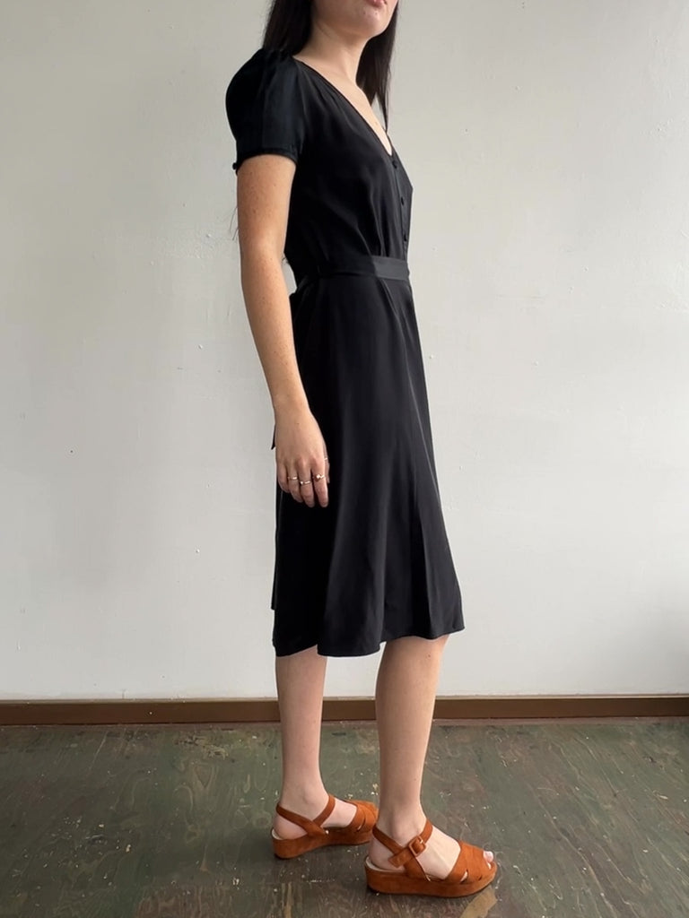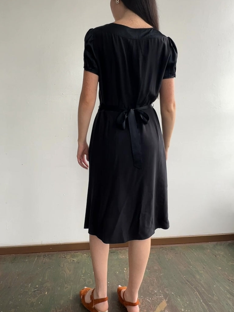 Marc Jacobs black silk cap sleeve dress with v-neck and buttons down the bodice. Includes a silk waist tie that is attached with belt loops. In great condition.