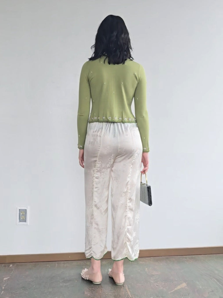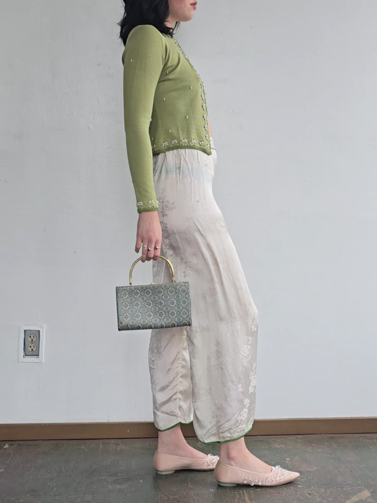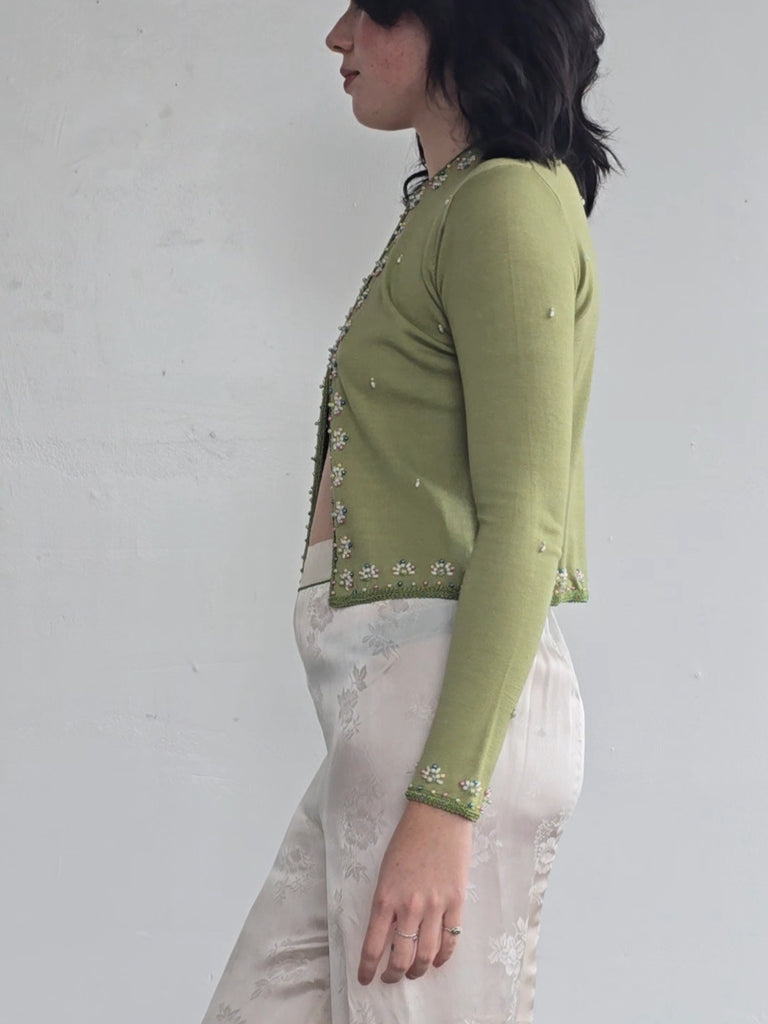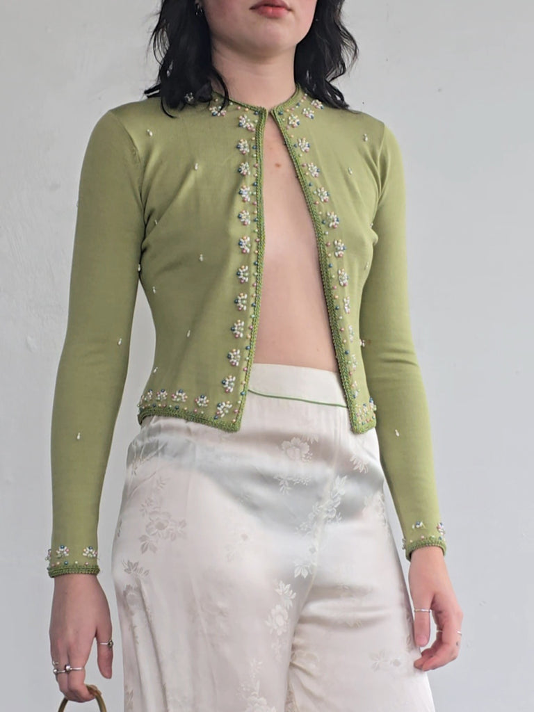 Vintage early Y2k pistachio green stretchy silk cardi with sweet beading and ribbon embellishment. Hidden hook + eye closures. Excellent condition, marked size S.