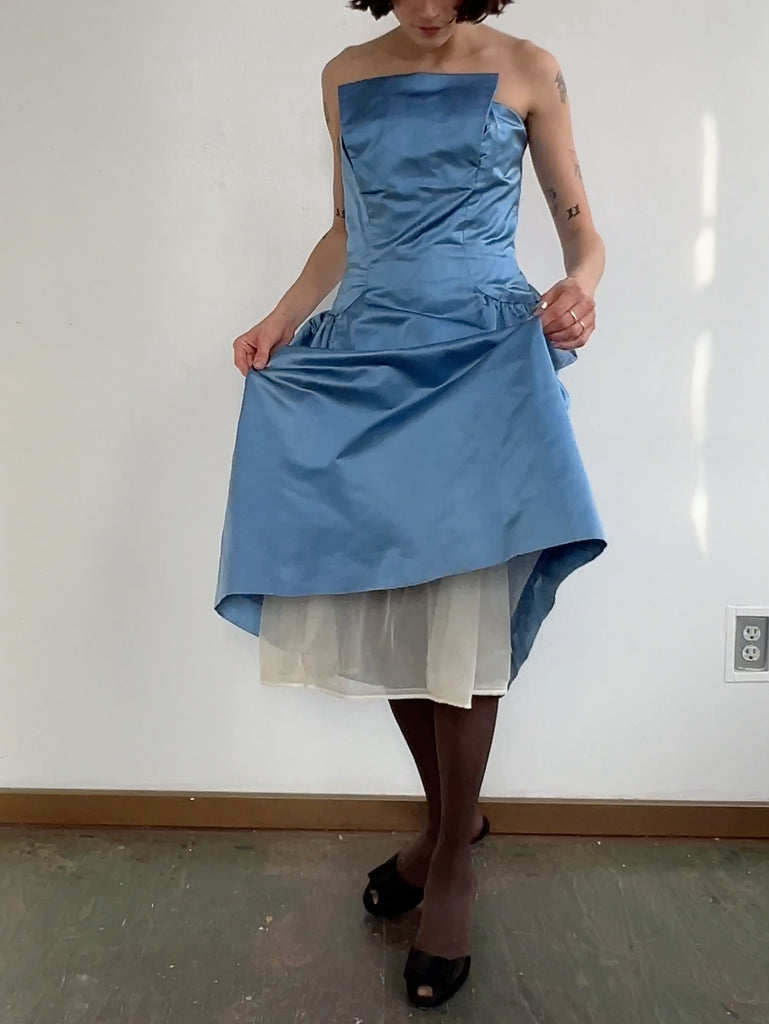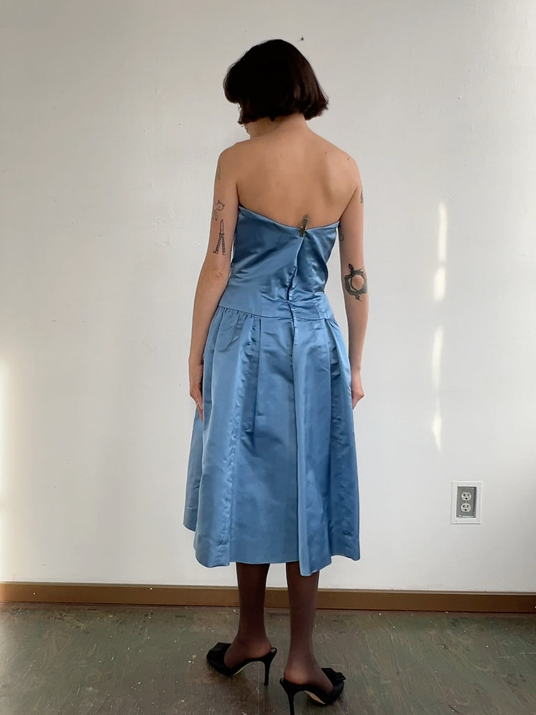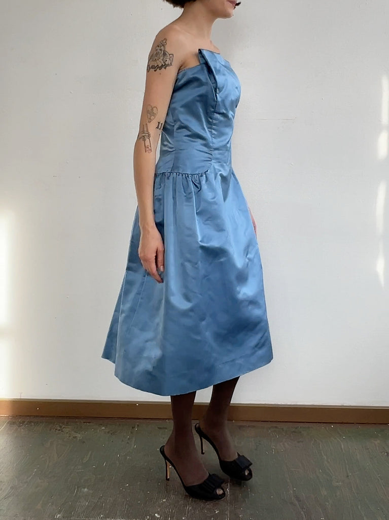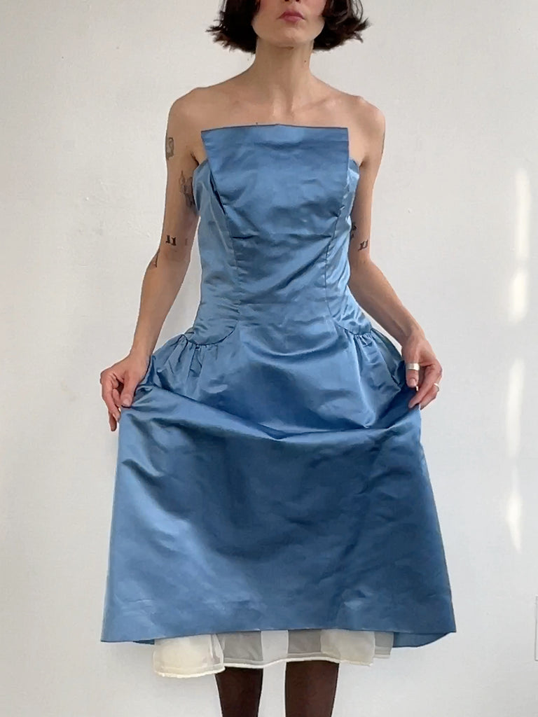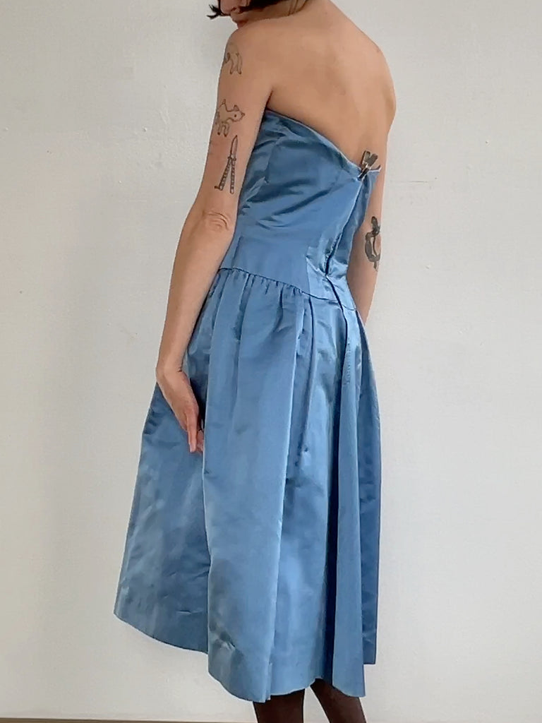 Beautiful Vintage blue satin sculptural satin strapless gown. Structured bodice with boning with a full skirt and a long center back zipper. A few minor spots of wear, but in great vintage shape.
