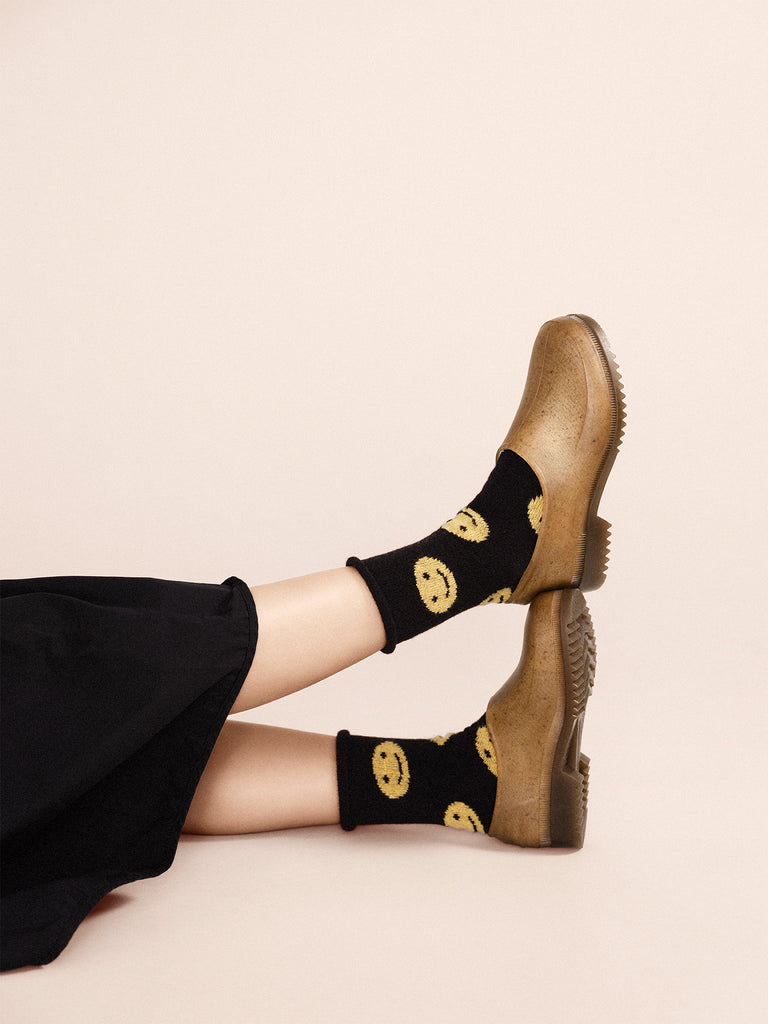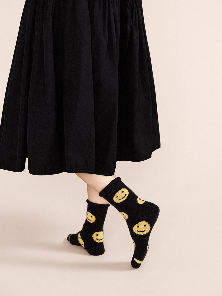 Fun happy faces on Hansel from Basel's classic Italia Cashmere Crew with a roll top and made with 80% cashmere. Love.