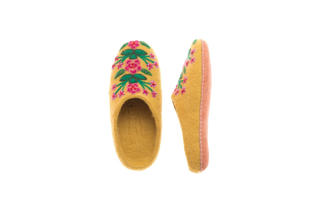 Take your lovely garden inside with you with these elegant Secret Garden Slippers. Inspired by ornate vintage slippers from the 1920s, each one is hand felted and hand embroidered by artisans in Nepal. Featuring intricate and bright floral embroidered designs that pop against the bright wool.