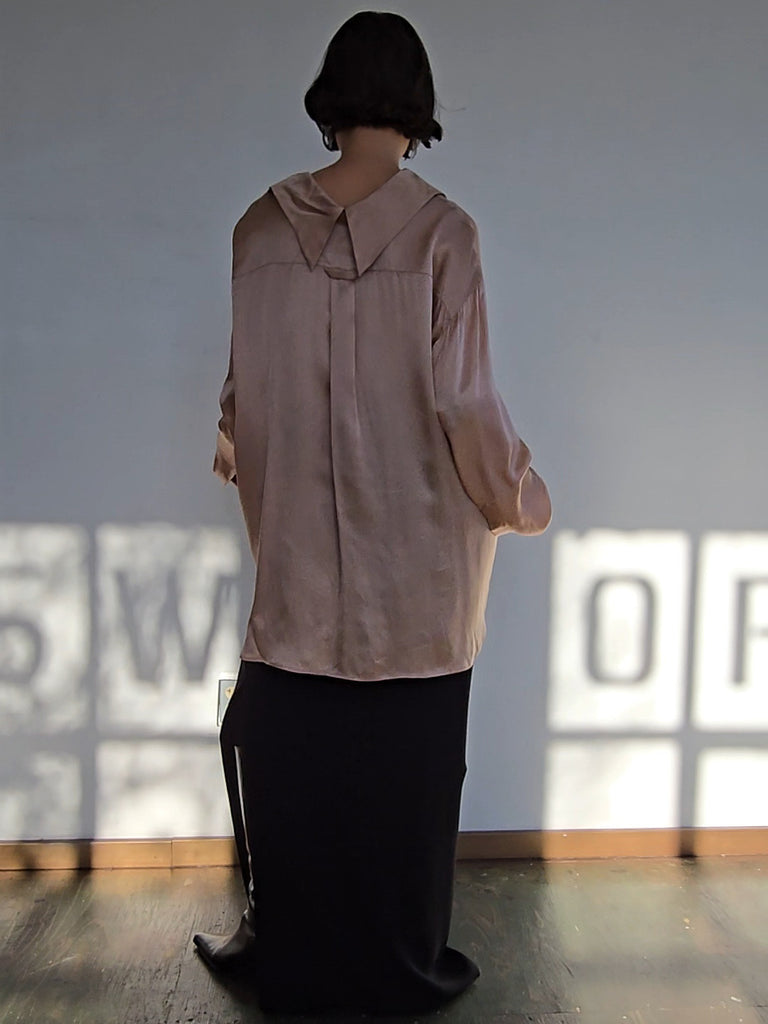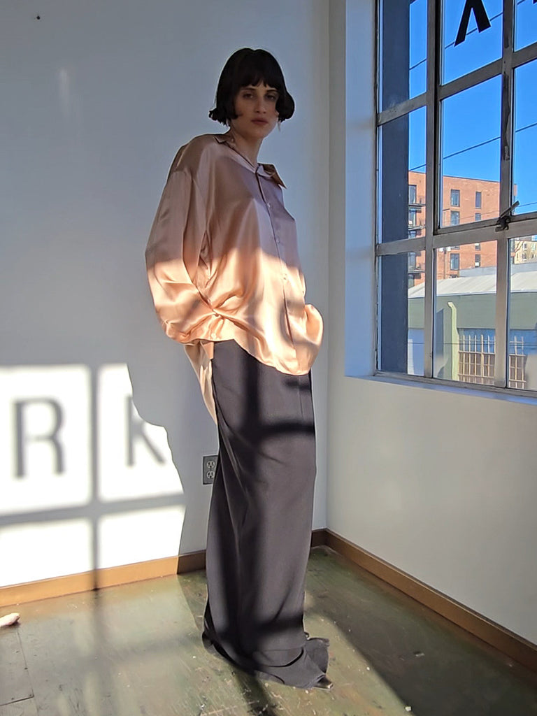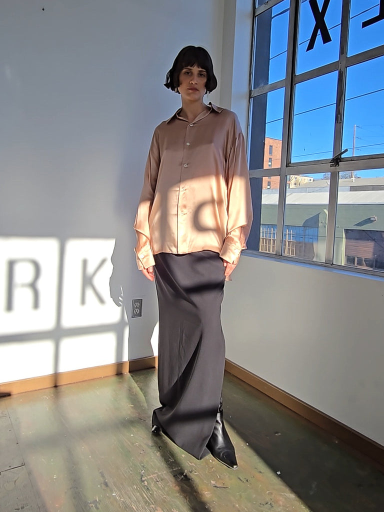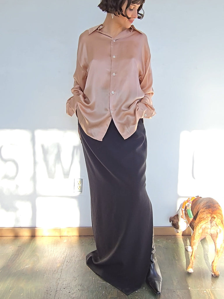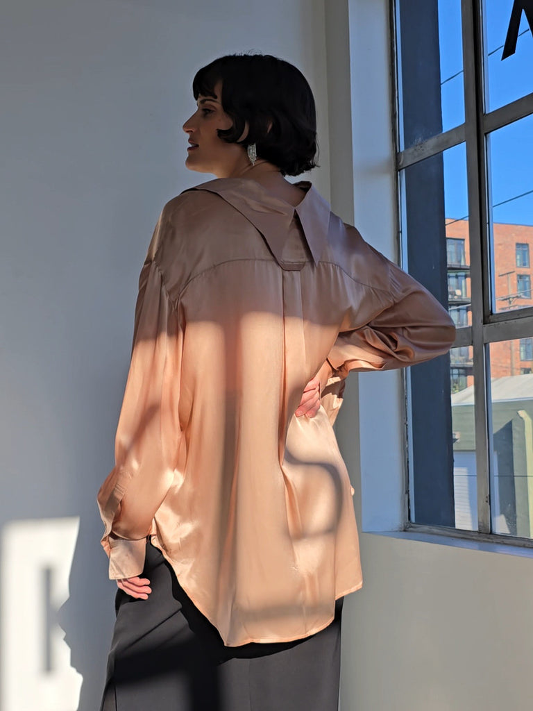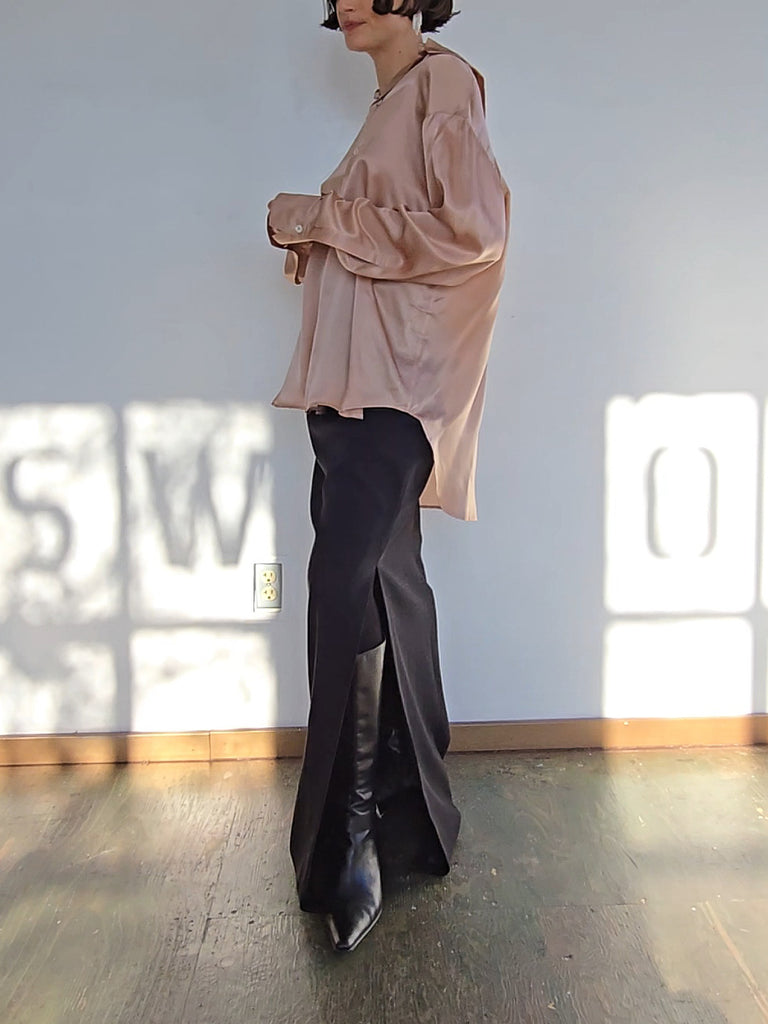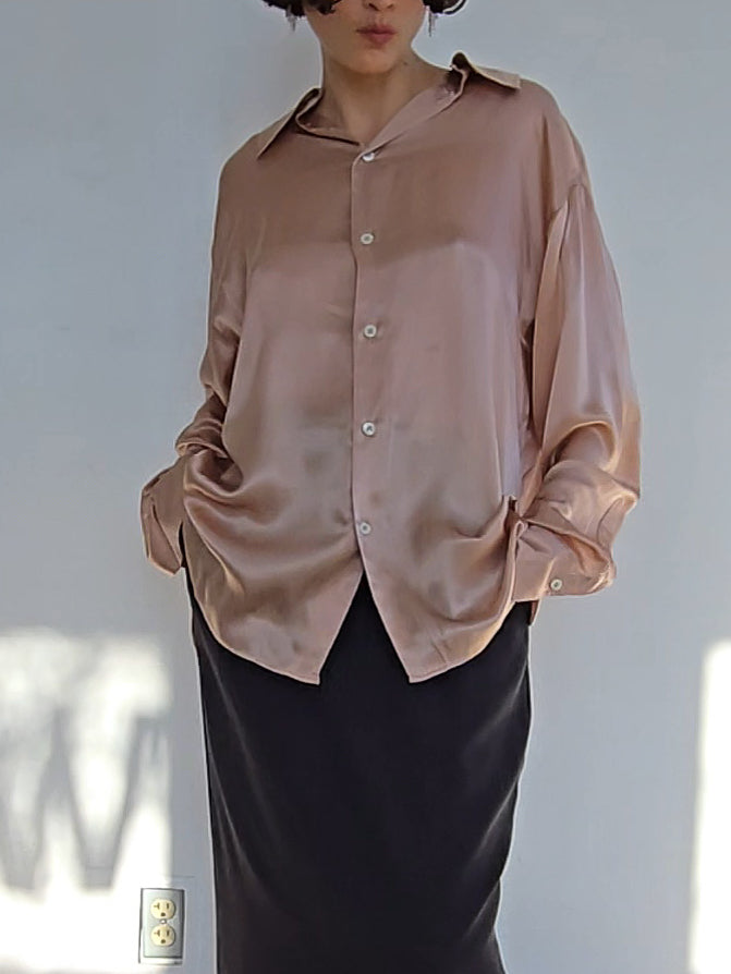 Champagne pink silk blouse. Oversized fit. Buttons up the front with a front and back collar. Excellent condition.