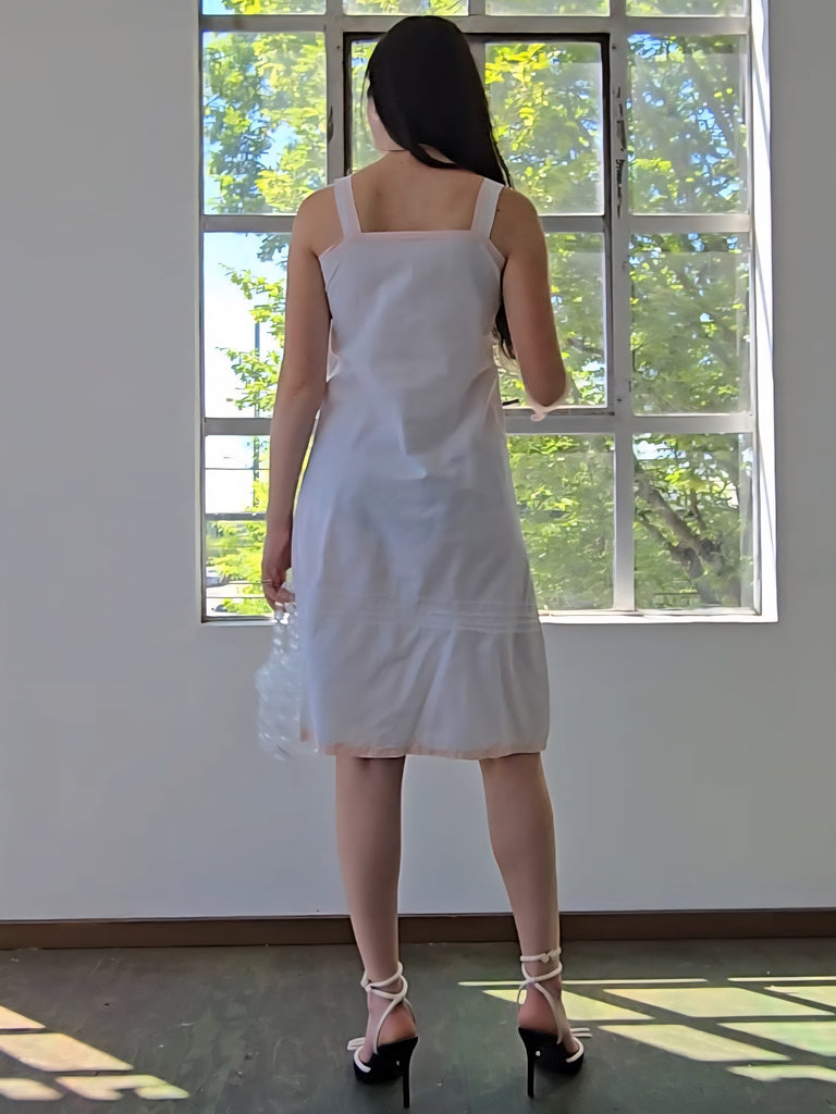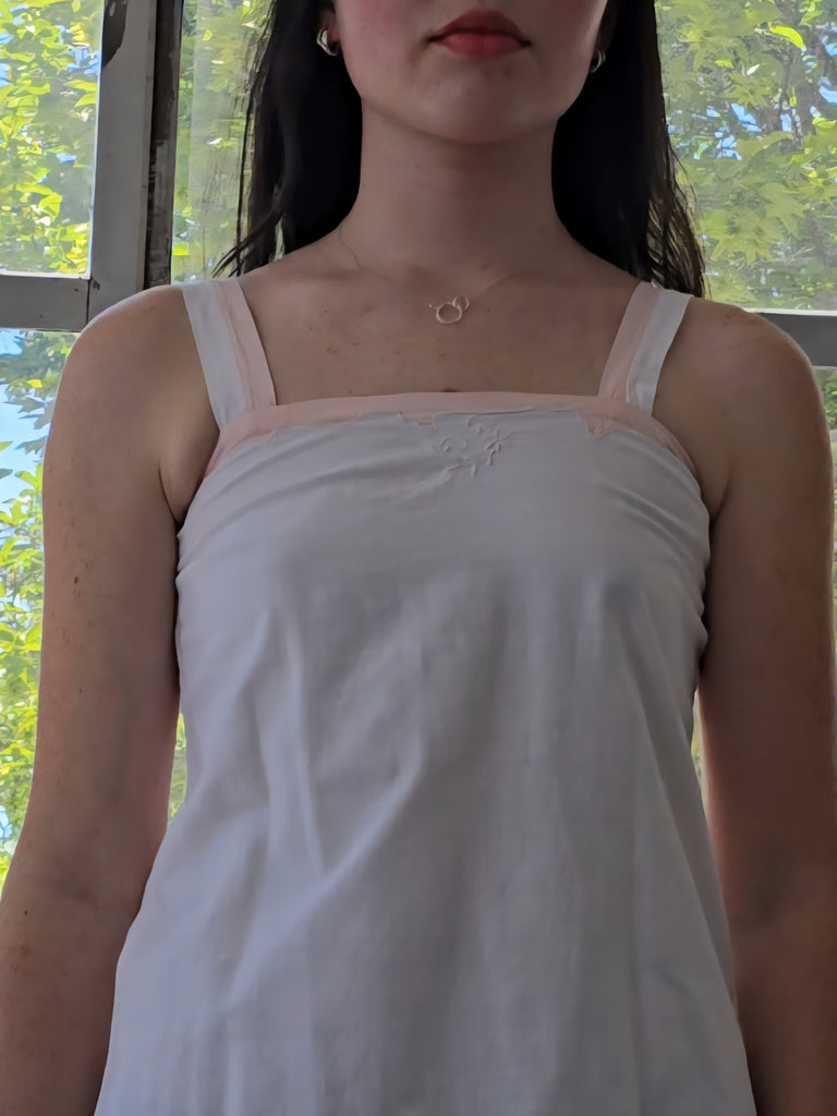Antique white cotton dress that has a square neckline with pink trim. There is a small floral emblem embroidered on the front. In great condition. No marked size.