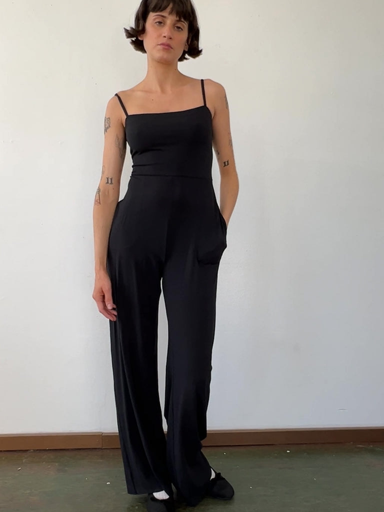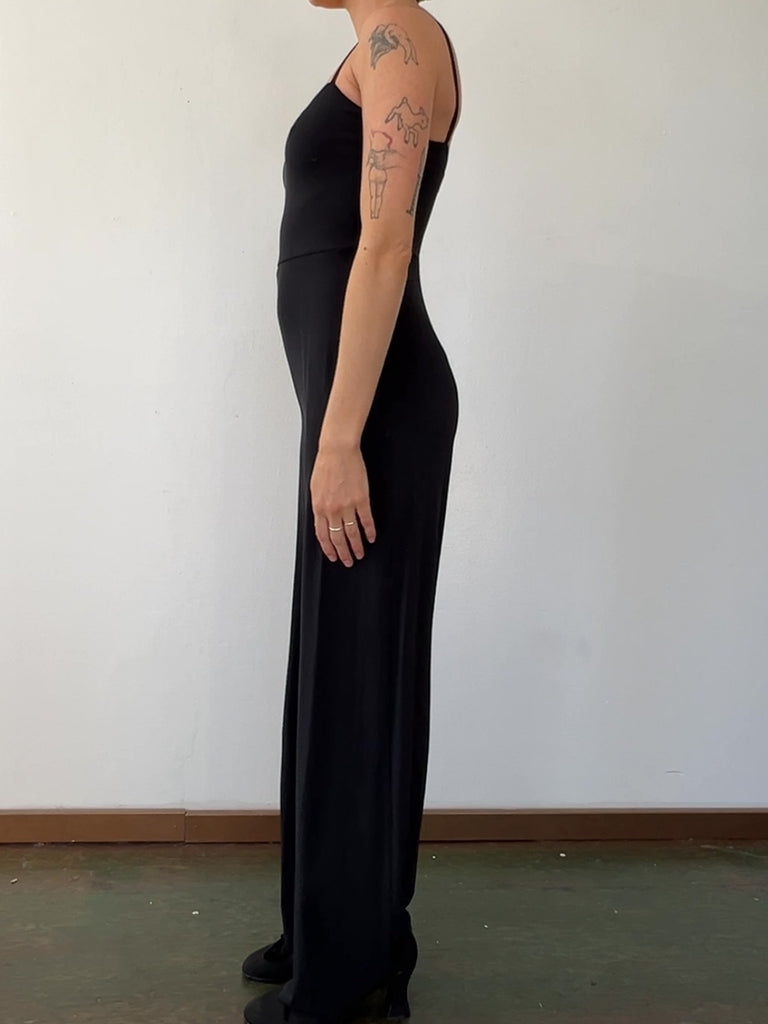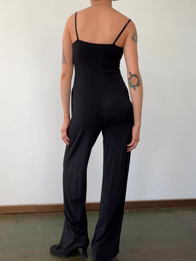 Vintage slinky black jumpsuit. Made in France by luxury label Eres. Black stretchy fabric with wide legs and a square cut neckline with spaghetti straps and pockets, pull on style without fastening. In excellent condition with tag attached.