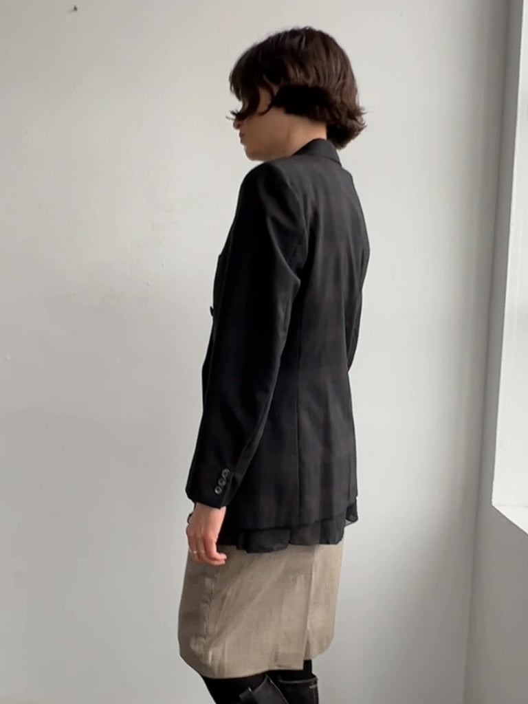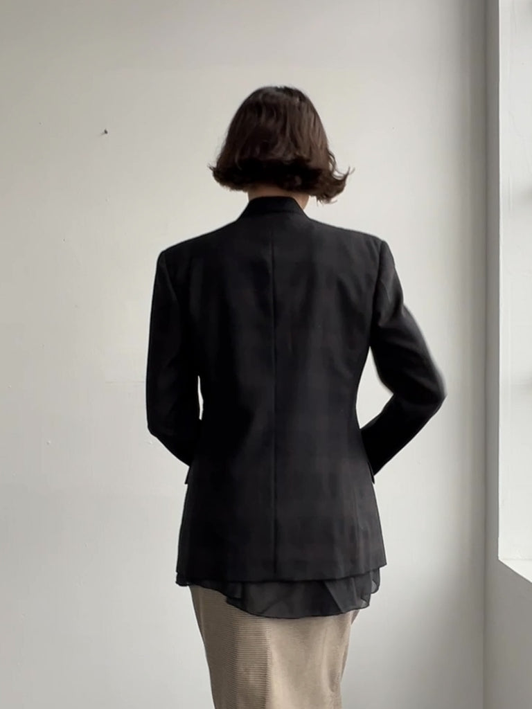 Double breasted blazer with subtle dark plaid print, a notched lapel and three pockets in the front.