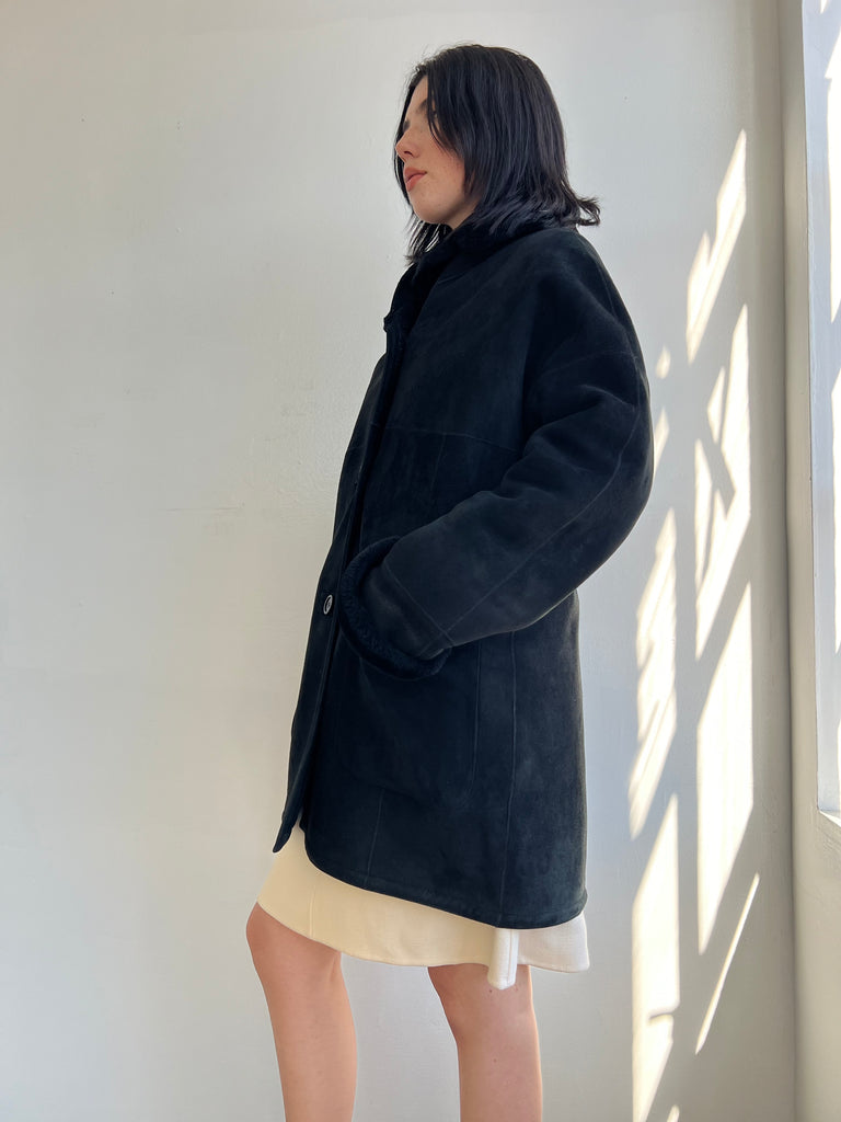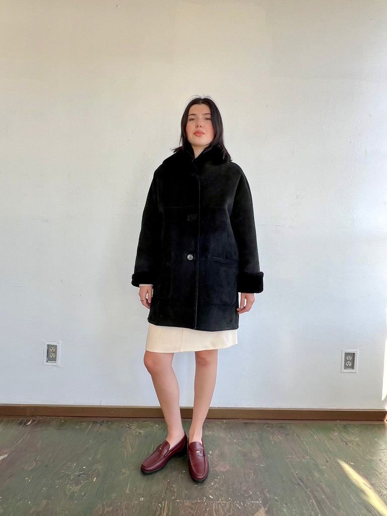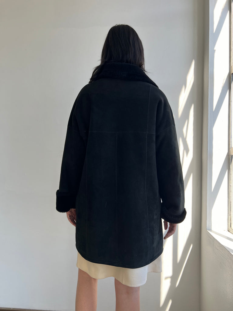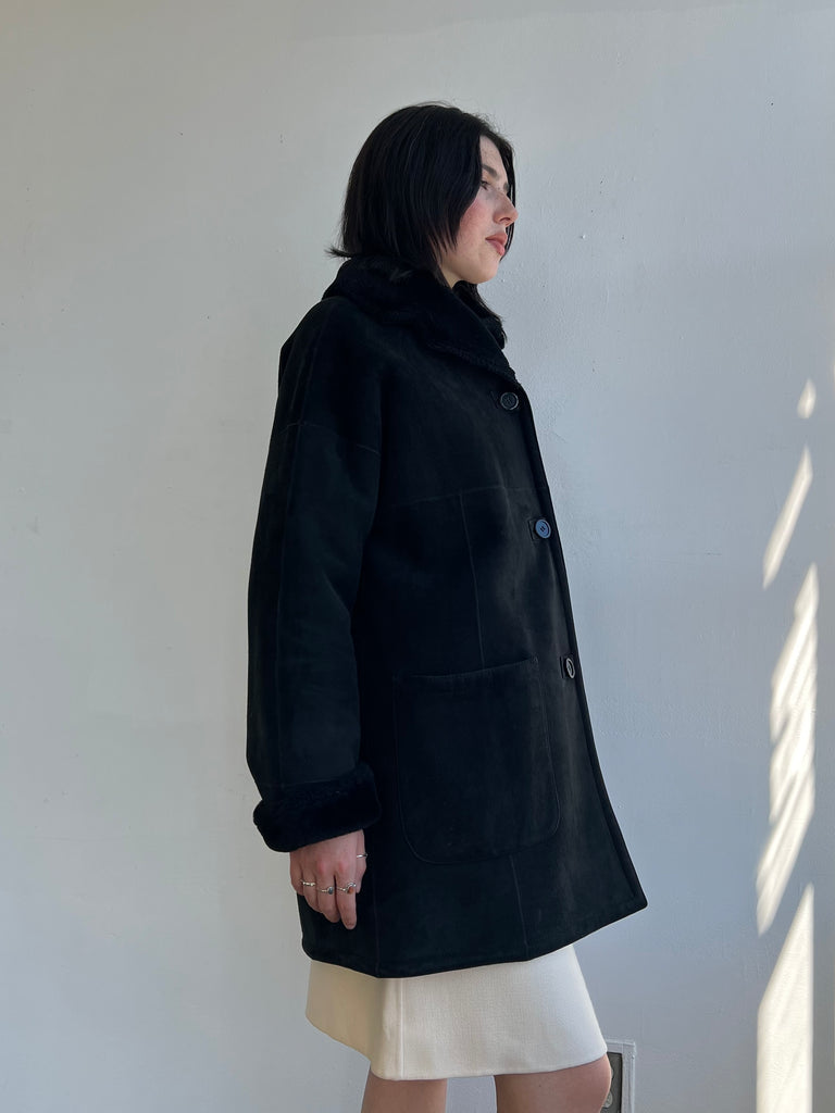 Black shearling suede coat with three button closures and two large pockets in the front. In great condition.