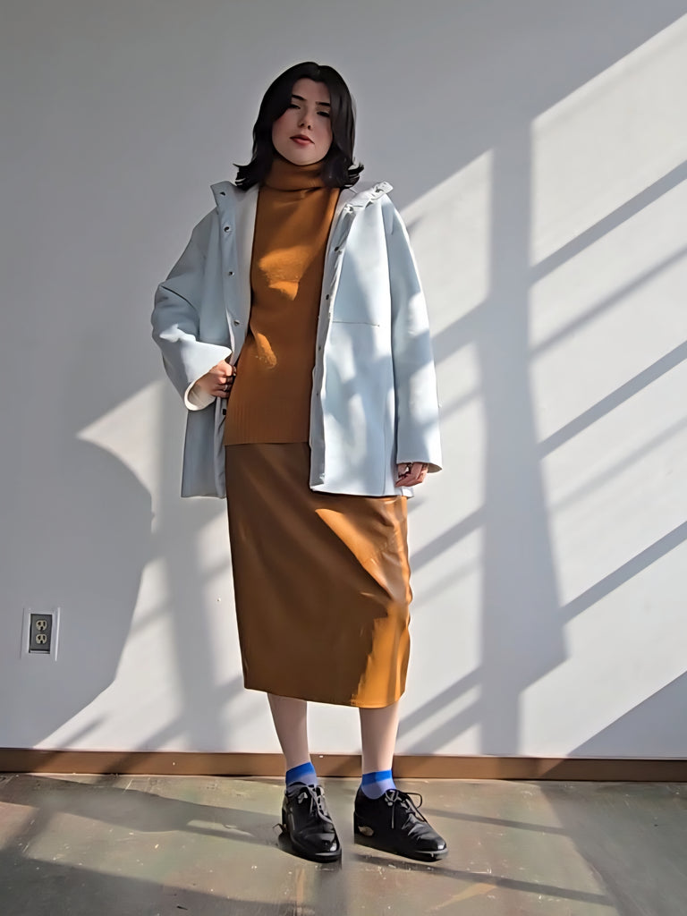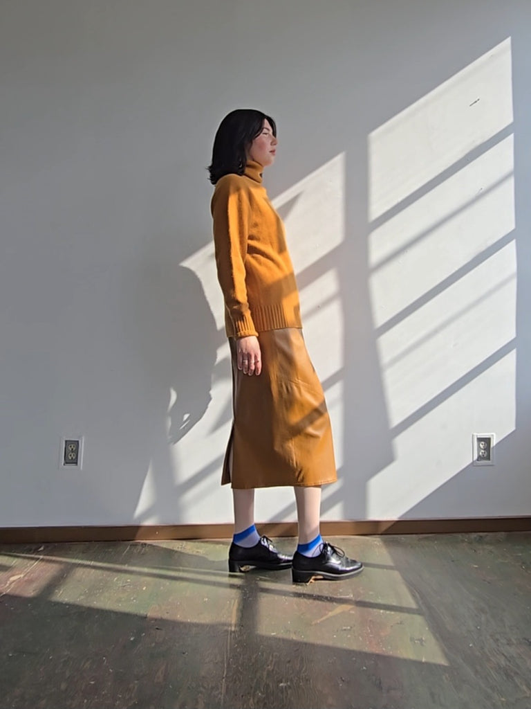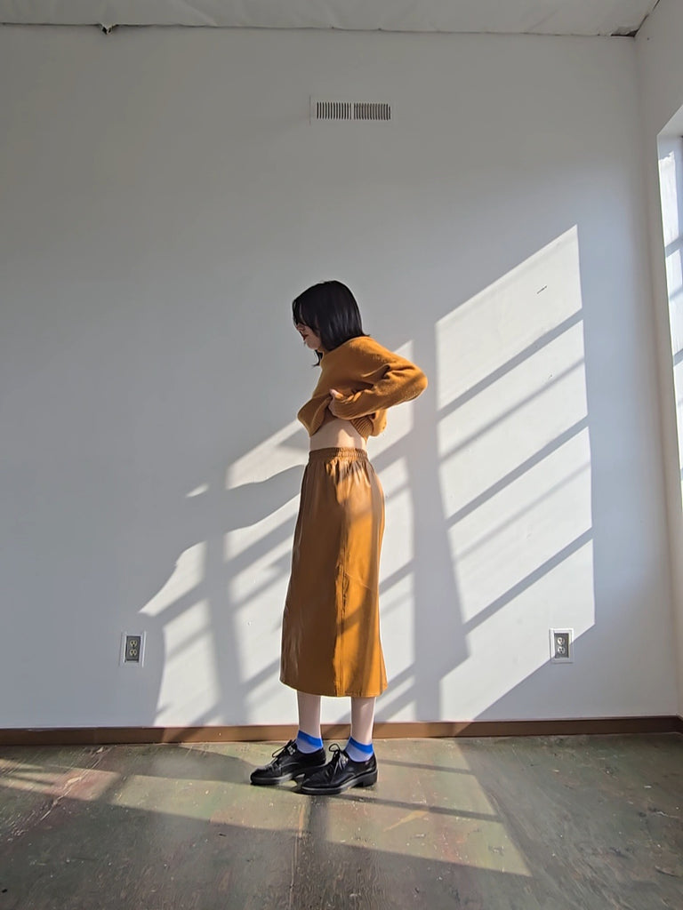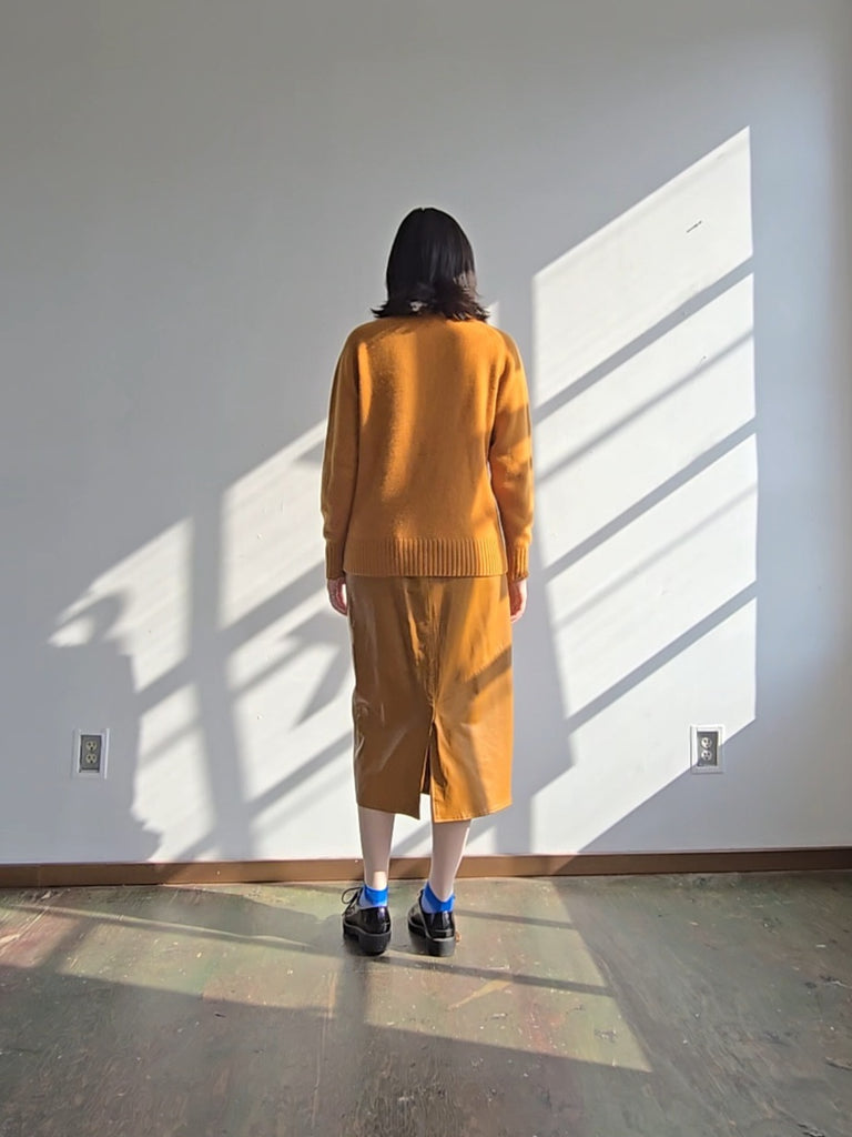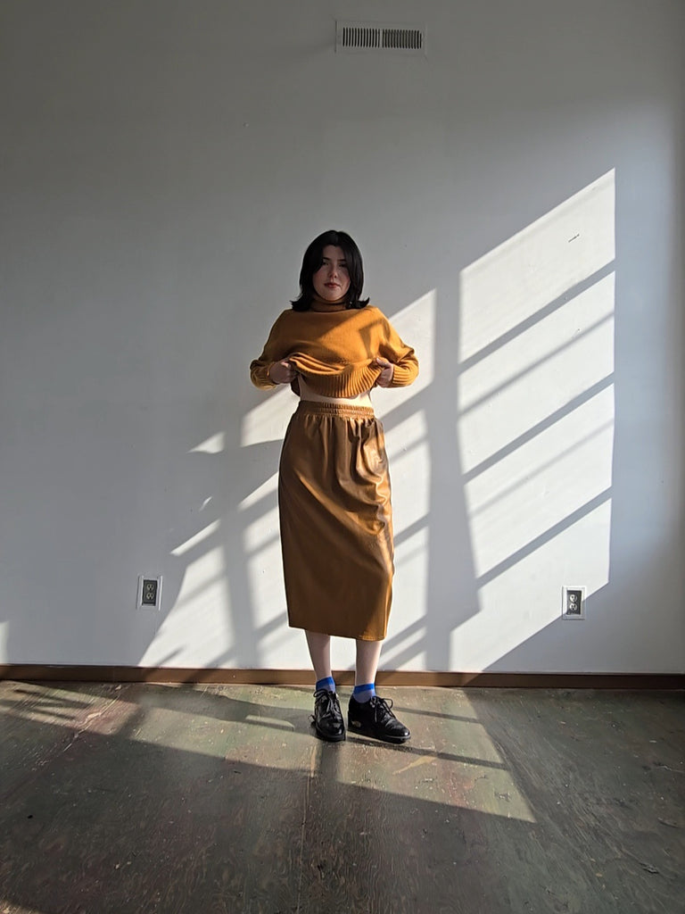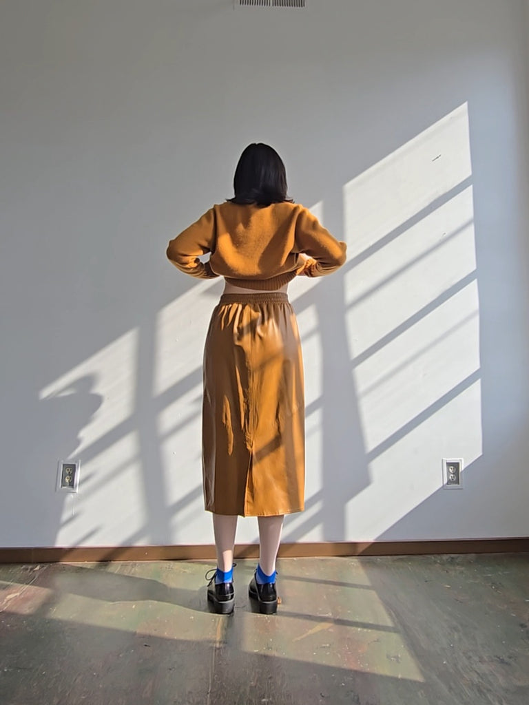Soft camel leather midi skirt with decorative stitchiing, an elastic waistband and a small slit in the back. There is a small tear at the top of the back slit but othewise the skirt is in great conditon. Marked size L.