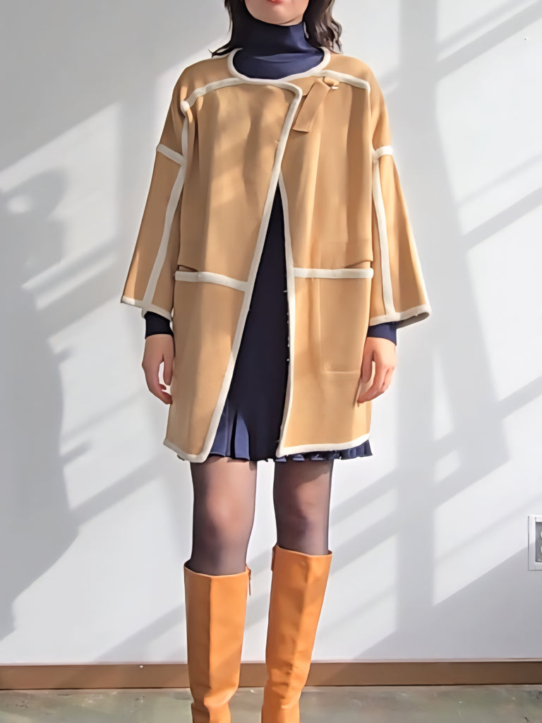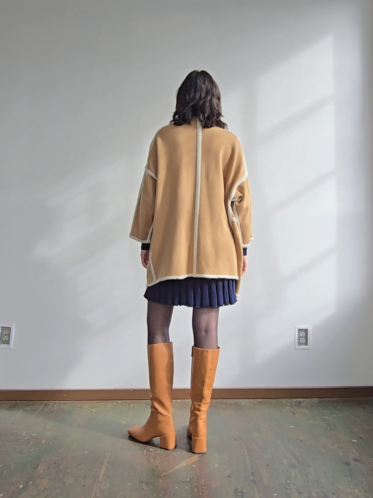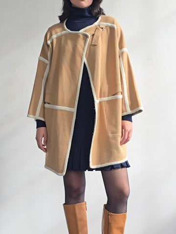 Chloe beige knit jacket with white deocrative seams, two pockets in the front and a D-ring closure at the neckline. There is slight pilling in the fabric but otherwise in good condition. Made in Italy. Marked size xxs