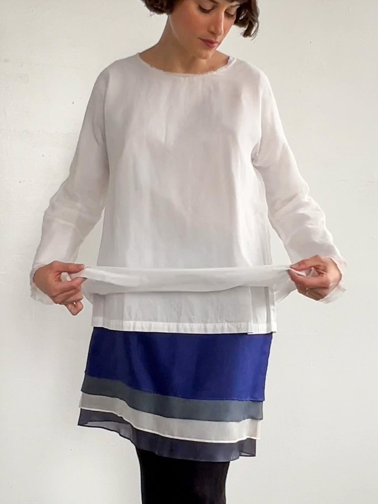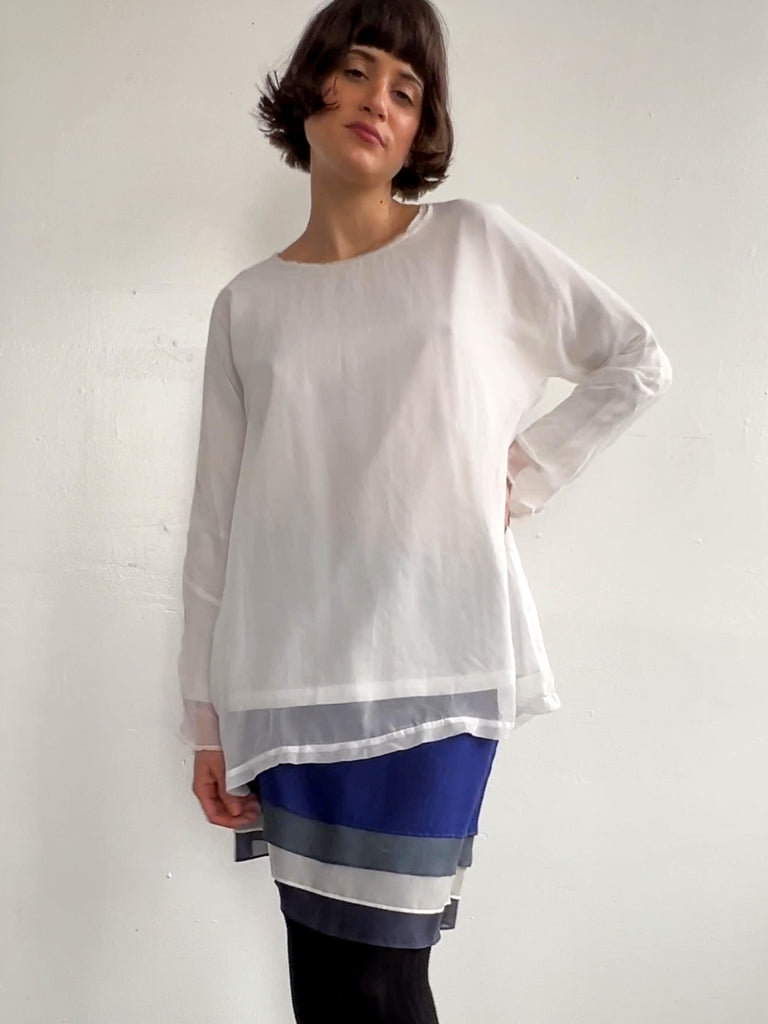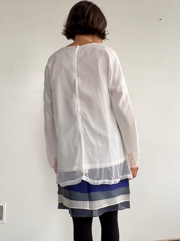 White Comme des Garcons long sleeve tunic with sheer layer on the outside.