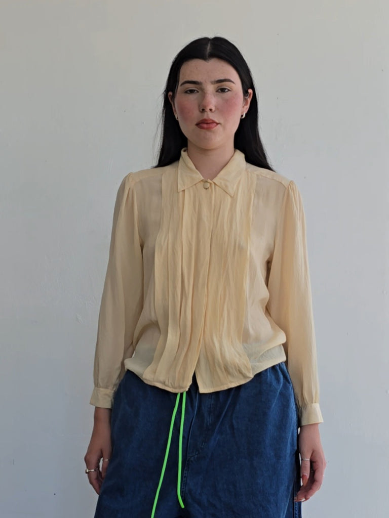 Cream silk long sleeve blouse with pleats down the front and hidden buttons. There is one large visible button at the neckline. In great condition. Marked size 12.