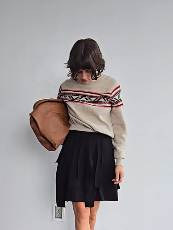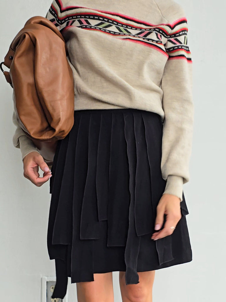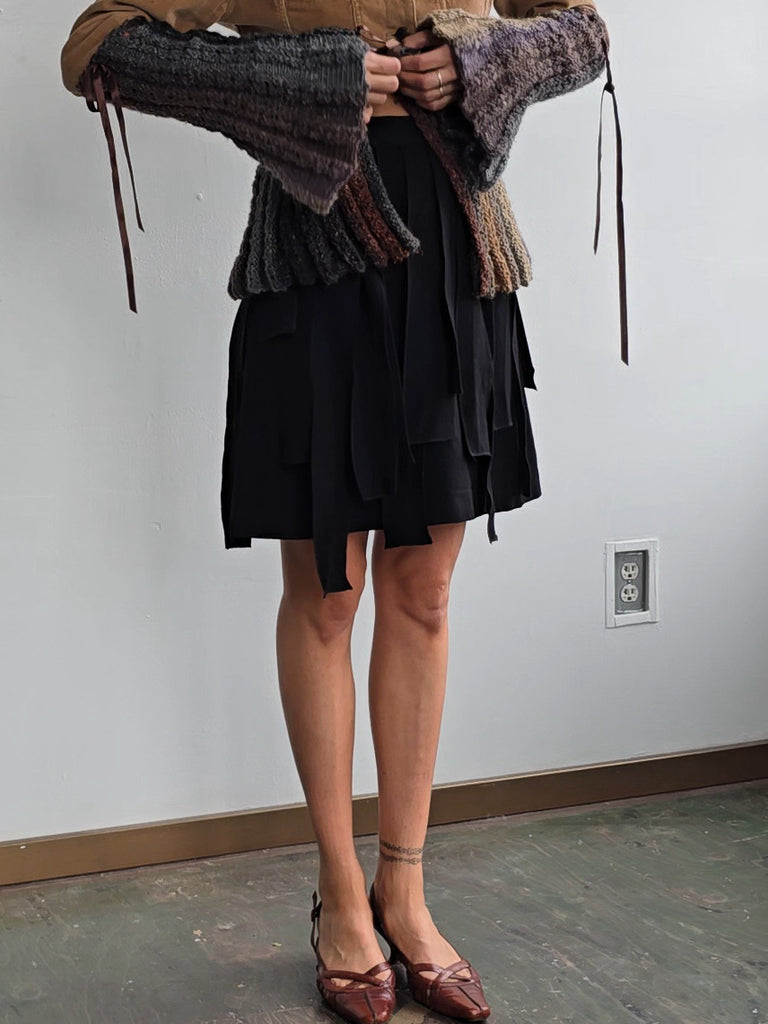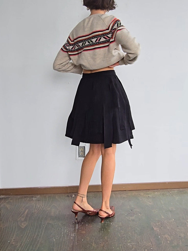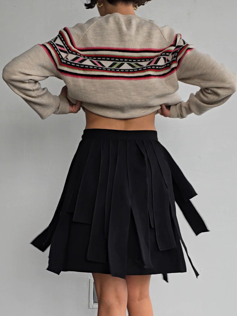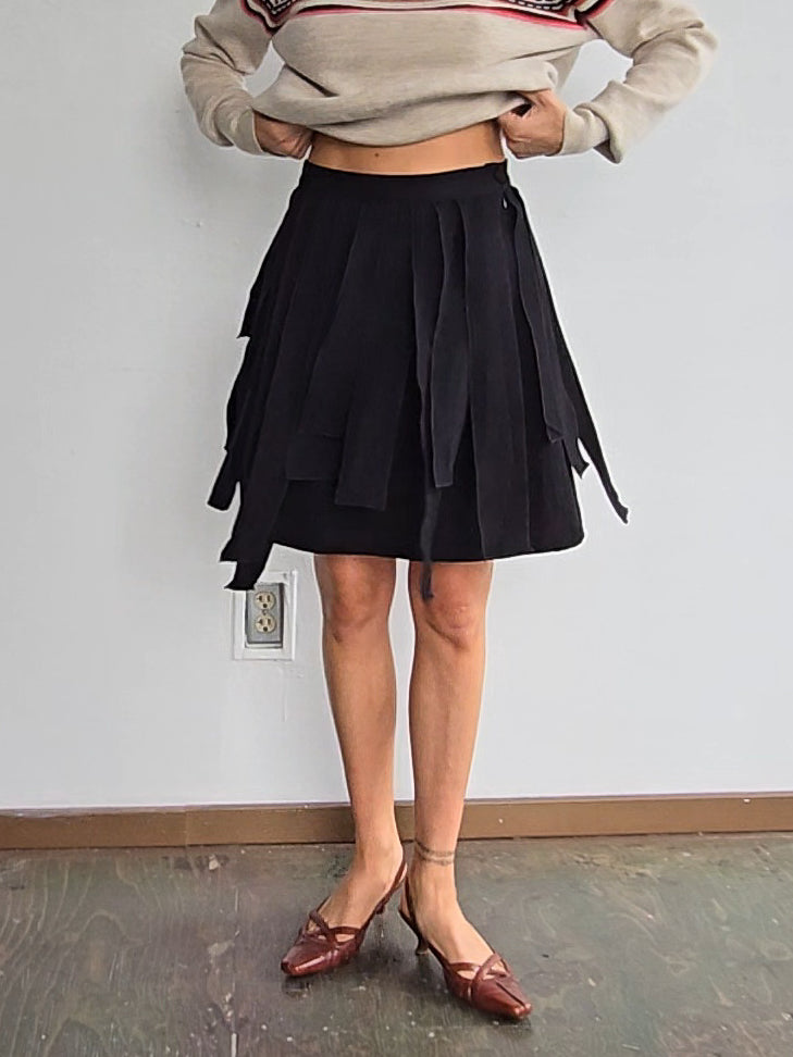Ultra unique vintage 100% wool miniskirt. Serged large fringe pieces throughout. Excellent vintage shape.