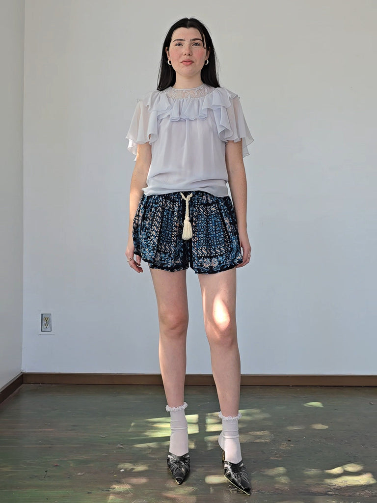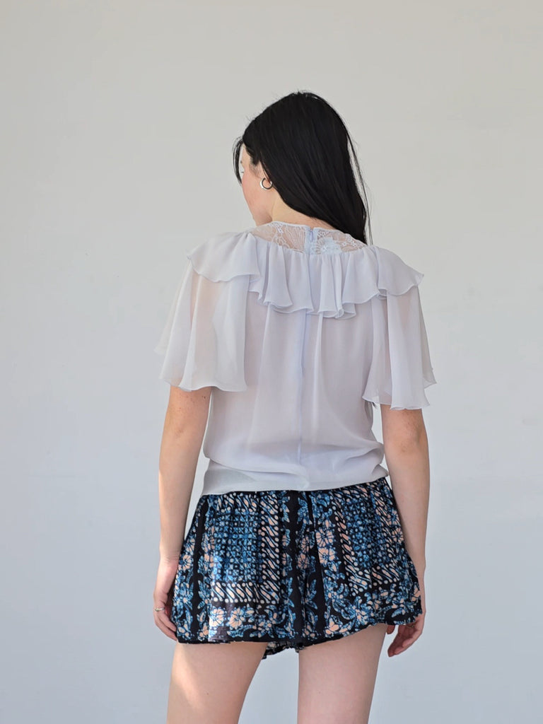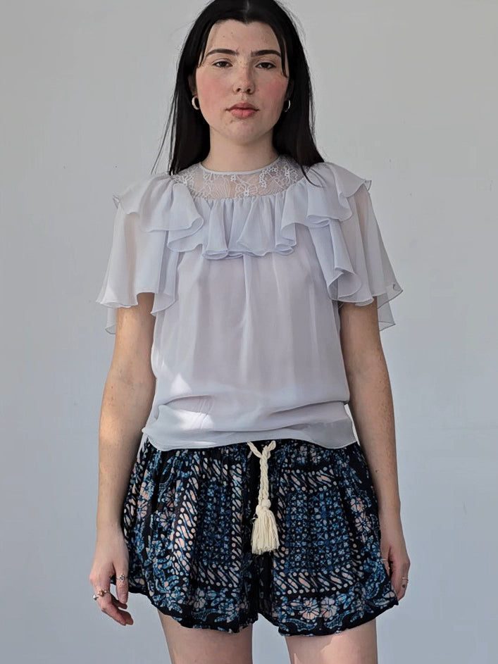 Giambatistta Valli pale grey-blue silk blouse with short flowy angel sleeves and a lace trimmed neckline. In great condition.
