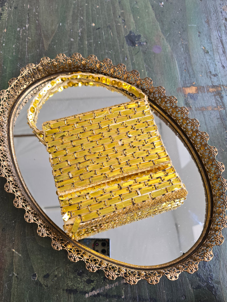Vintage 1960s gold handbag with different shapes of gold sequins. A few loose threads, great condition for age.