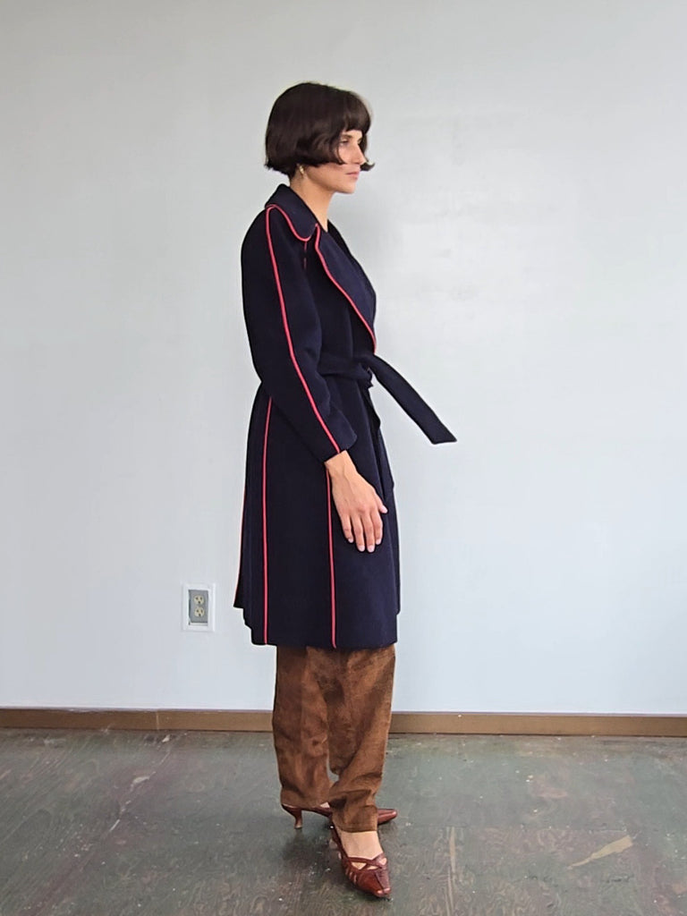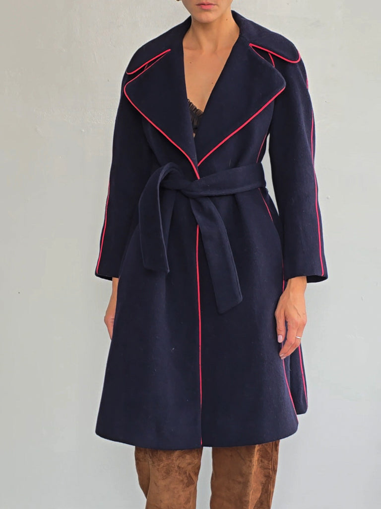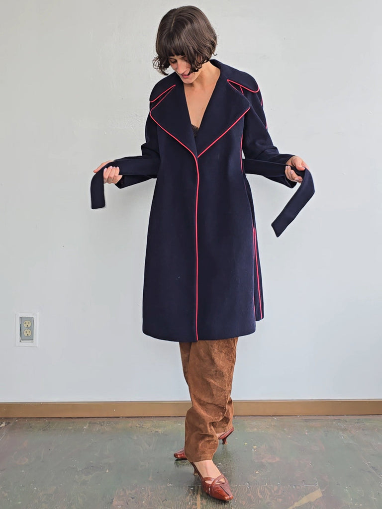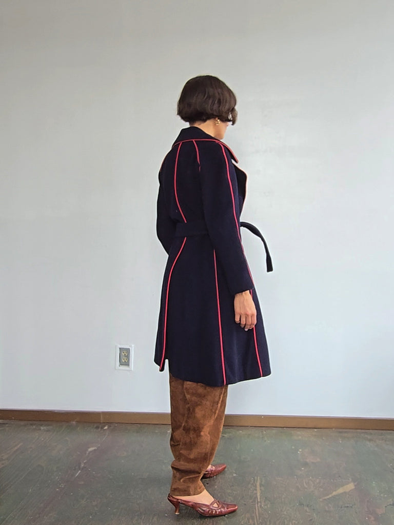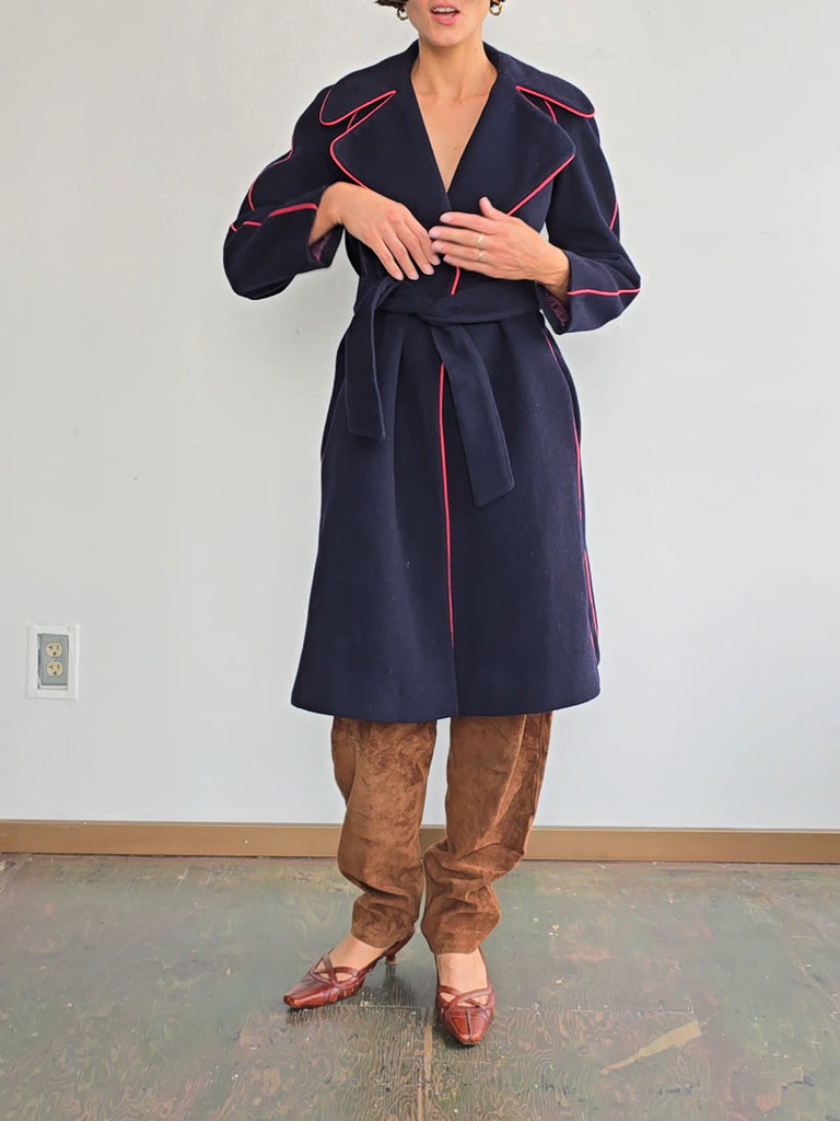 Vintage dark blue overcoat with hot pink trim. Horseshoe print lining. Open fit with a belt to close. In excellent vintage shape.