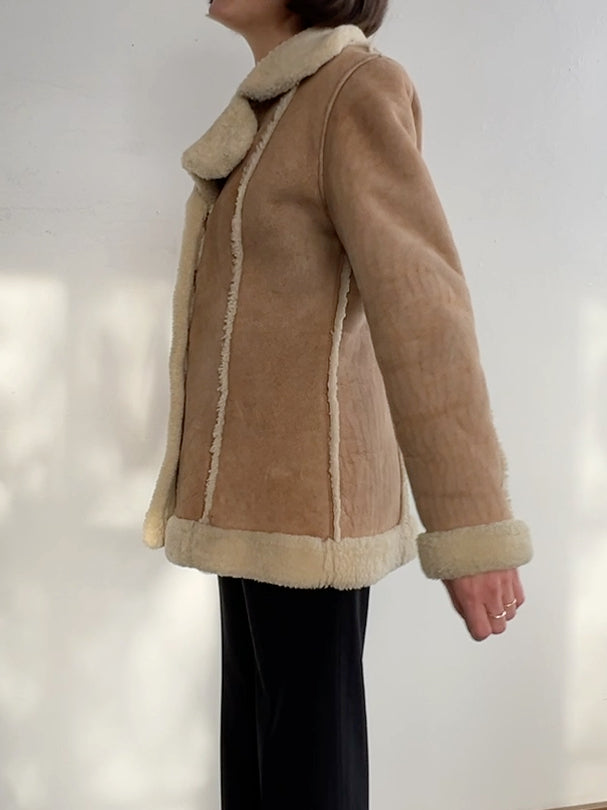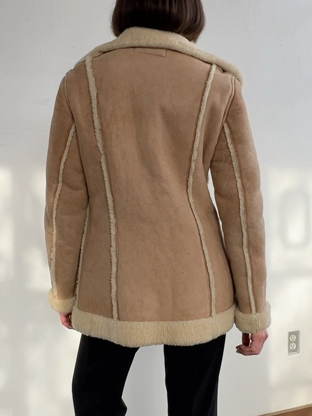 Vintage cozy shearling coat made by The Sheep Shack in Boise Idaho. Circa 1970s. Pale tan with light soft natural shearling lining. Cute curved lapel with buttons up the front. A few minor marks of discoloration but in great shape.