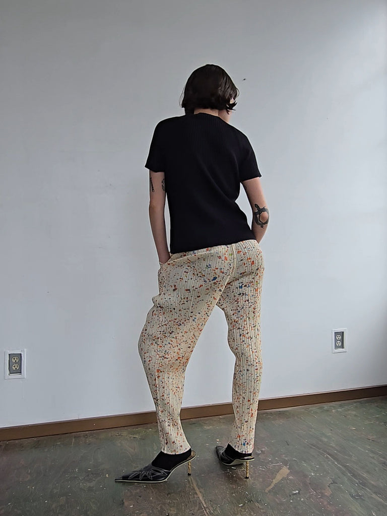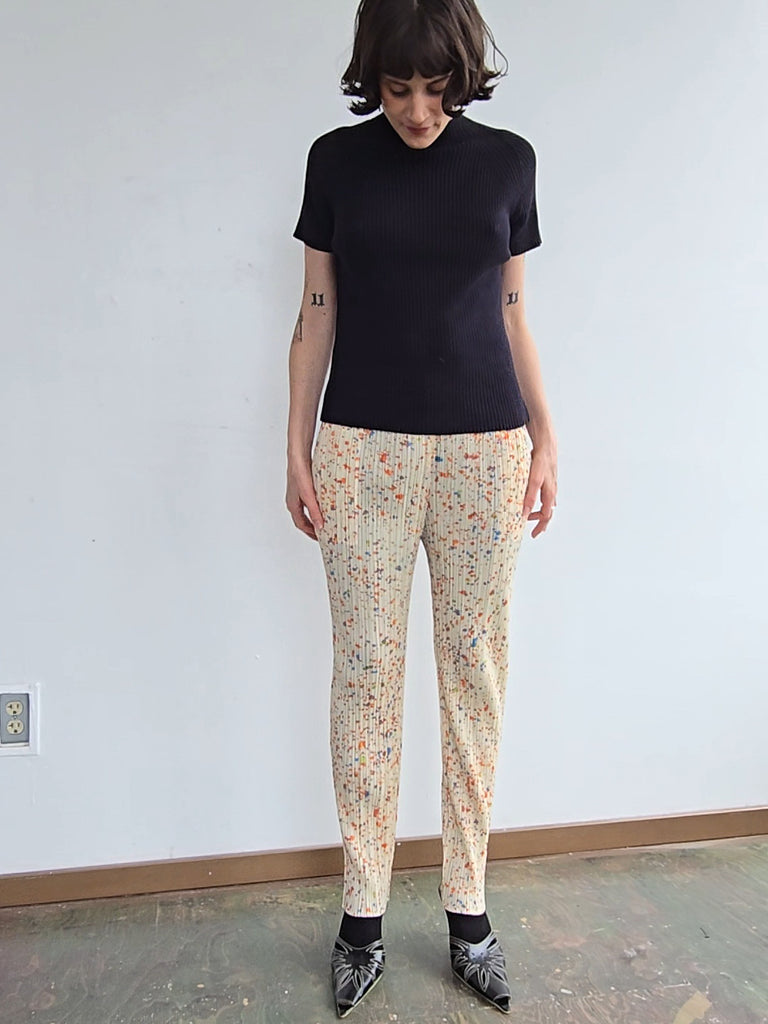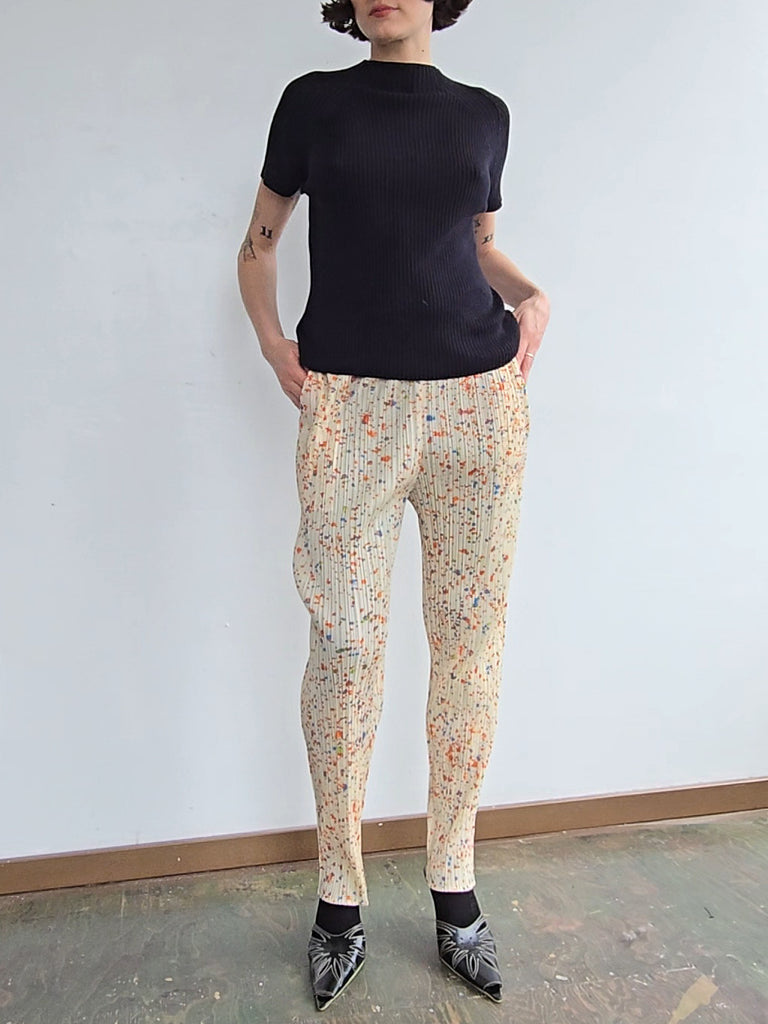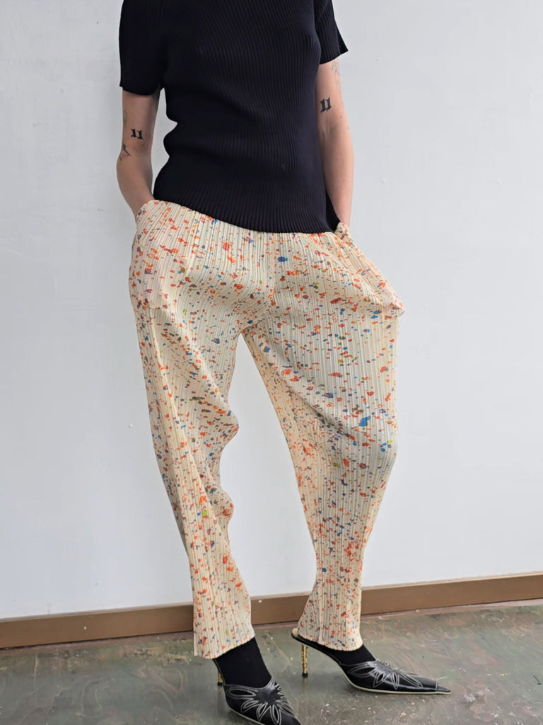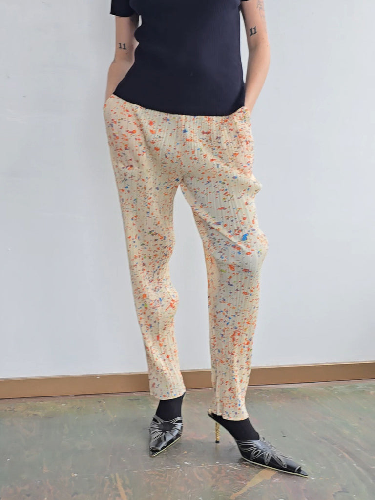 Cream pleated pants with blue, orange and green splatter print. Excellent condition