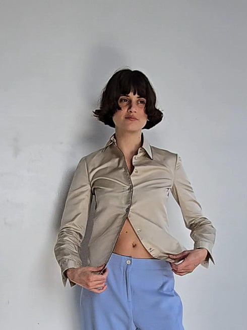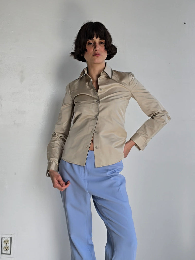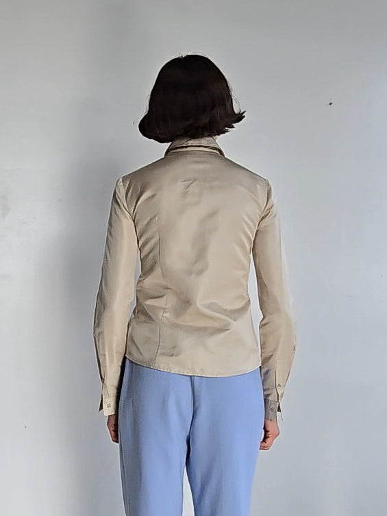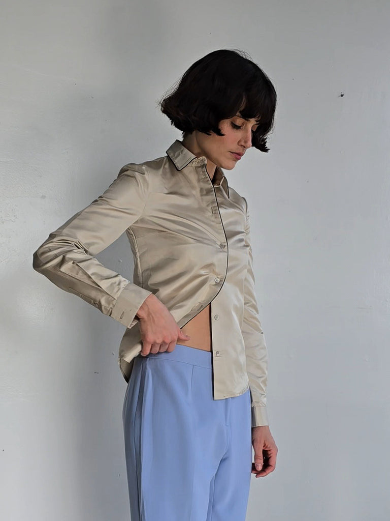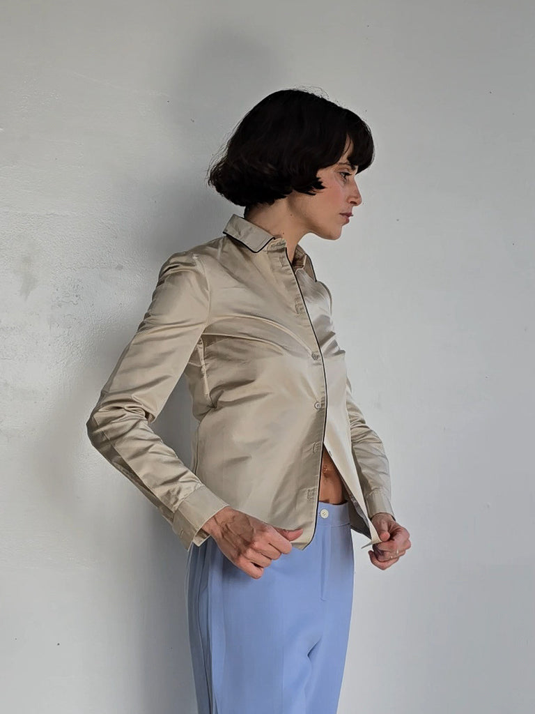 Jil Sander Navy silk button up. Minimalist and chic. Grey with lack piping and dainty buttons up the front. Great condition.