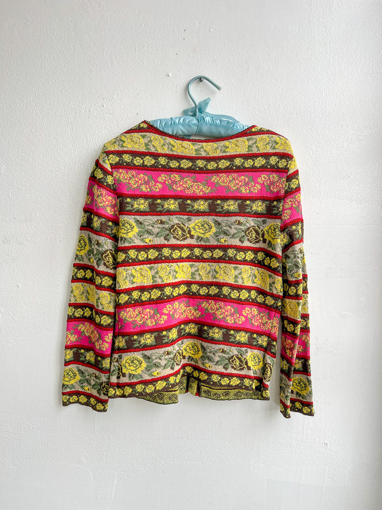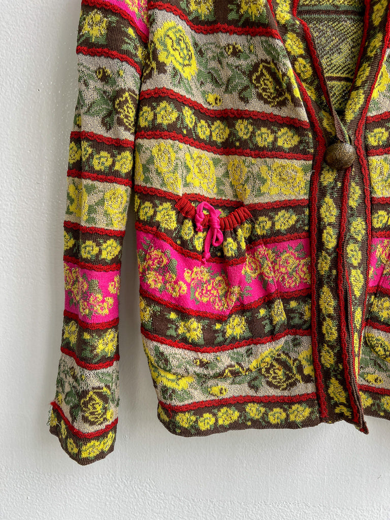 Y2K era Kenzo knit cardigan with a stripe rose print design and a touch of sparkle. Cute drawstring pockets with pink bows on either side with a single decorative button closure In great condition with a few minor pulls.