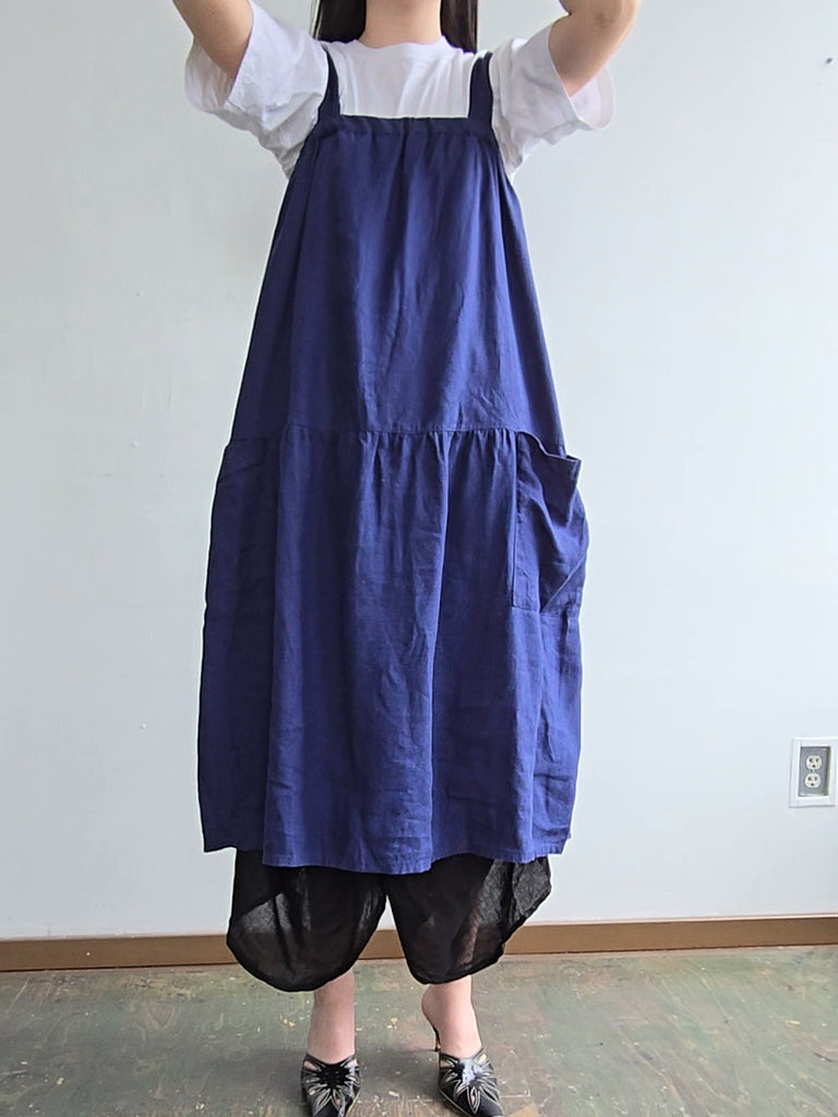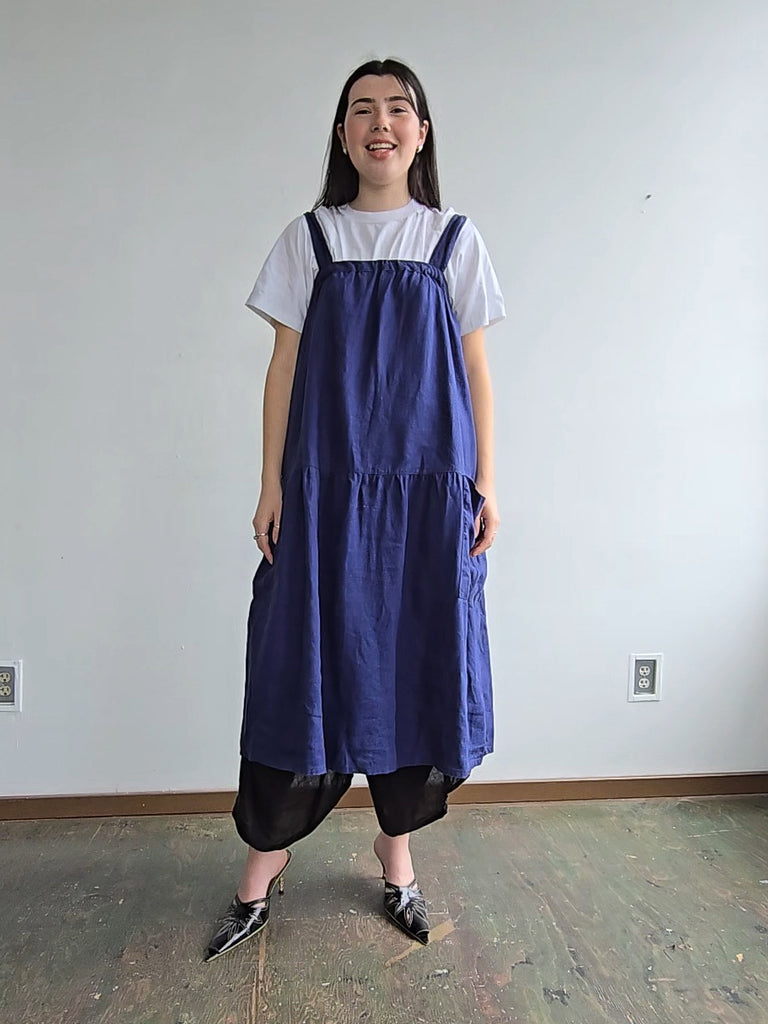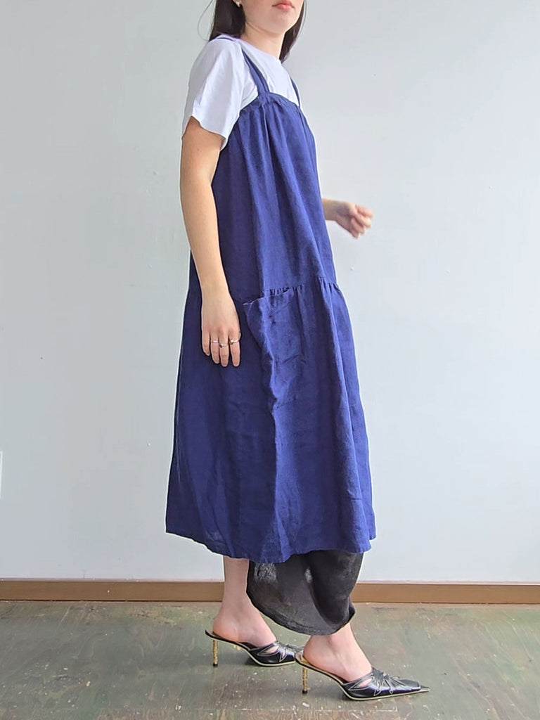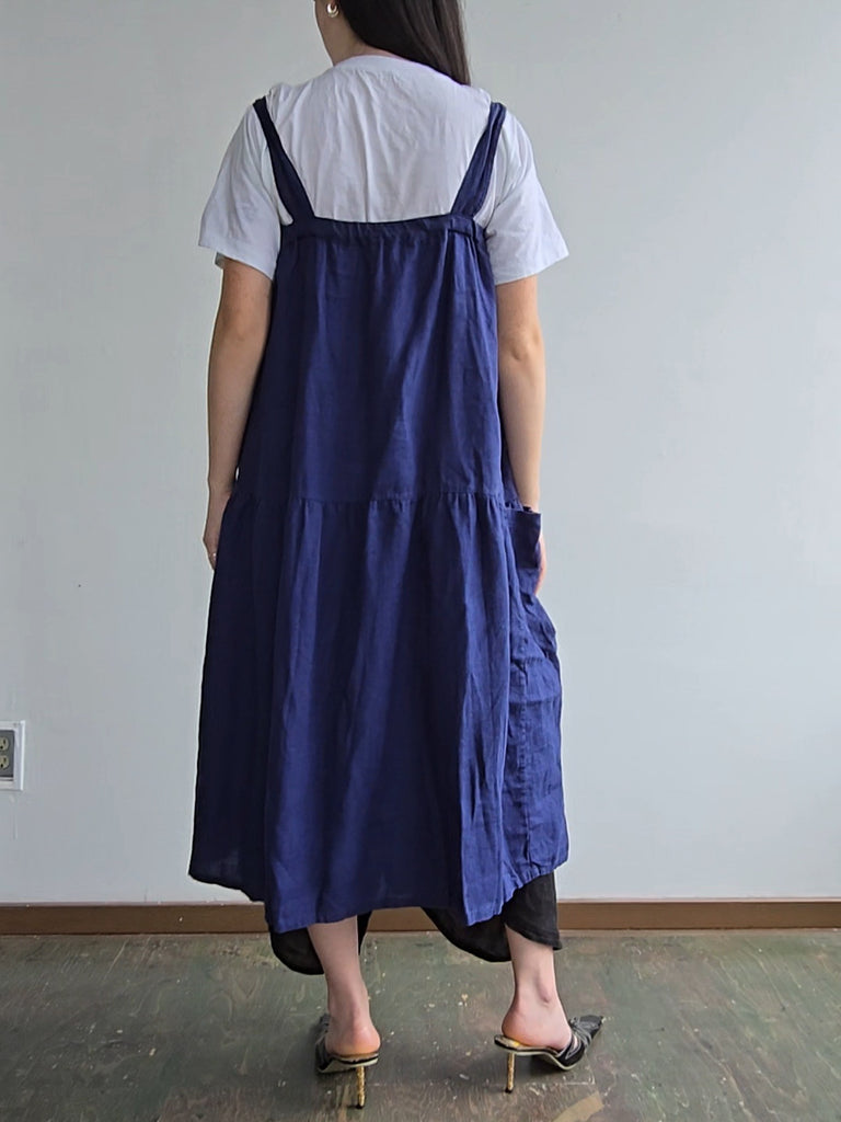 Kondi blue linen sleeveless jumper dress with elastic bust and spacious pockets at the hips. In great condition.