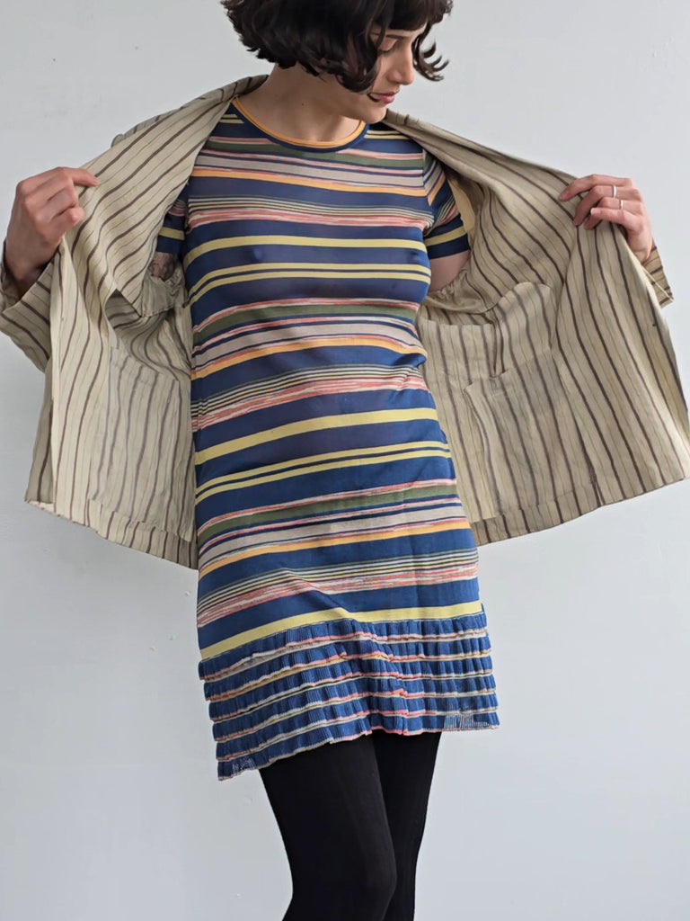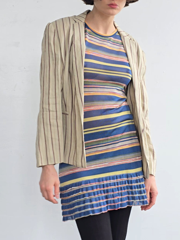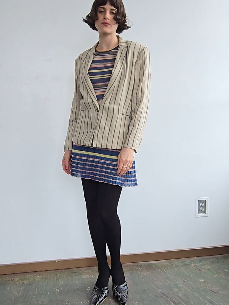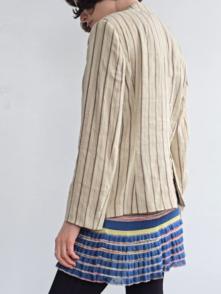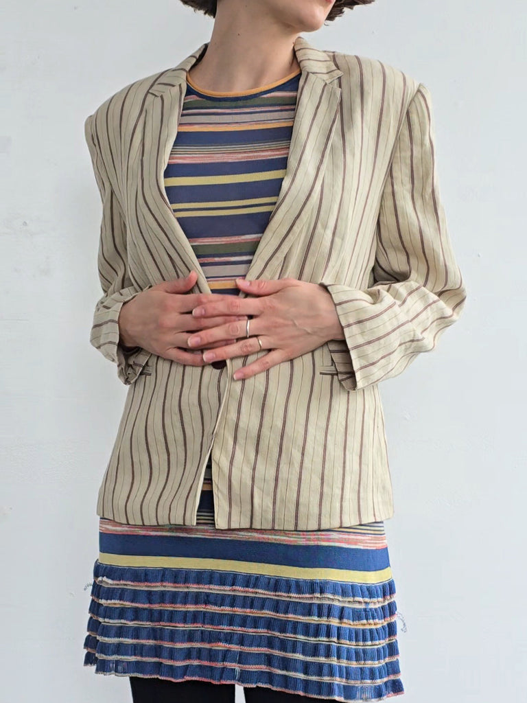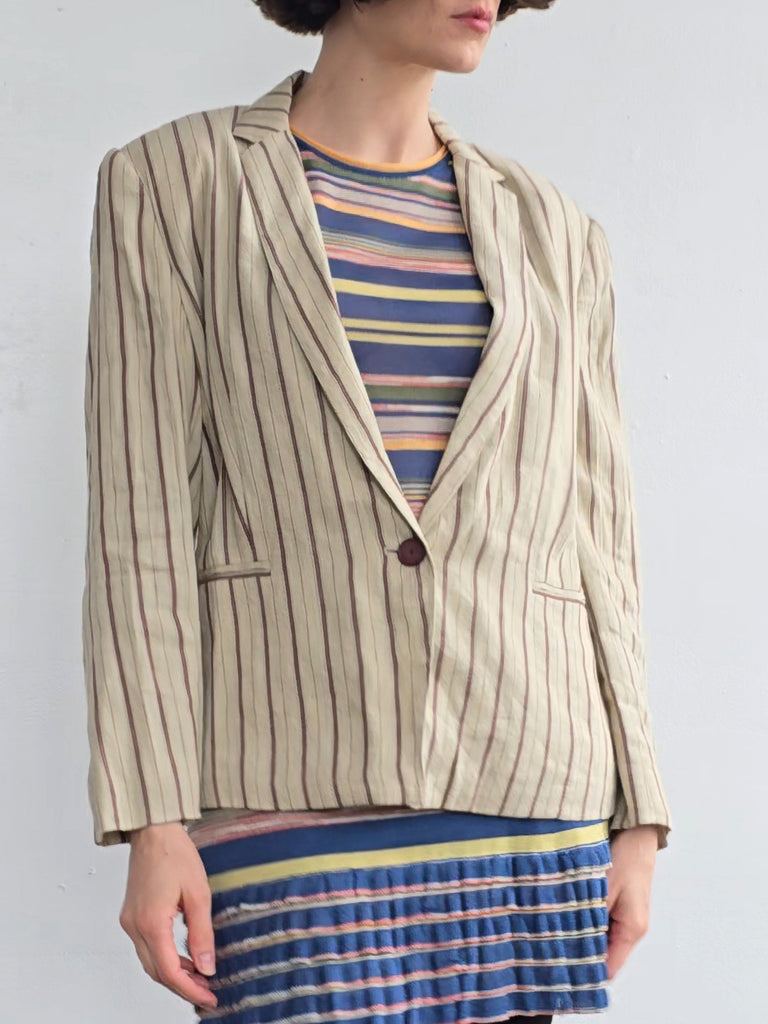 Krizia oat colored linen blend blazer with burgundy stripes. Features a notched lapel, a single button at the waist, and two pockets. Excellent condition.
