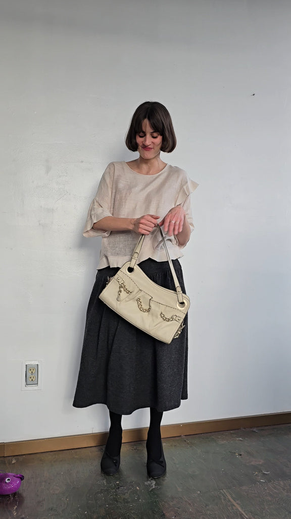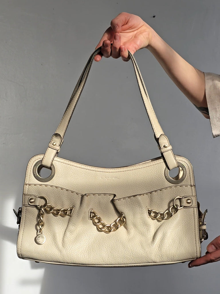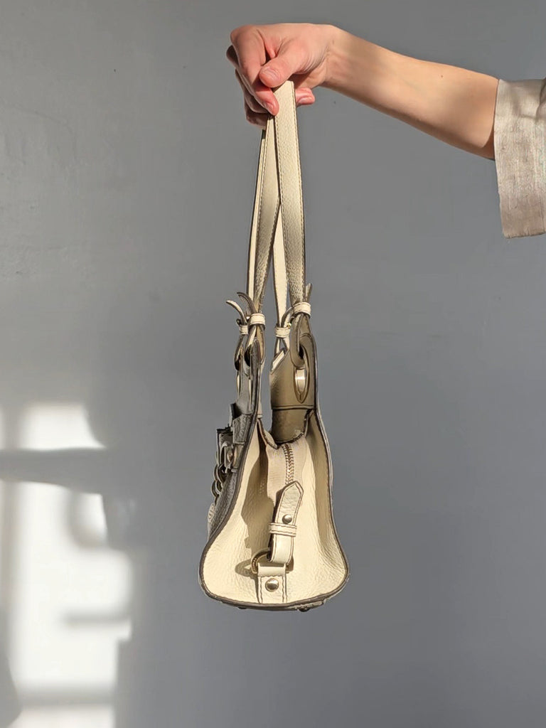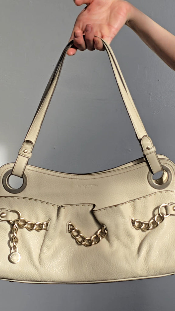 Y2K era white leather shoulder bag. Structured with metal accents and a zippered closure. Great vintage shape.