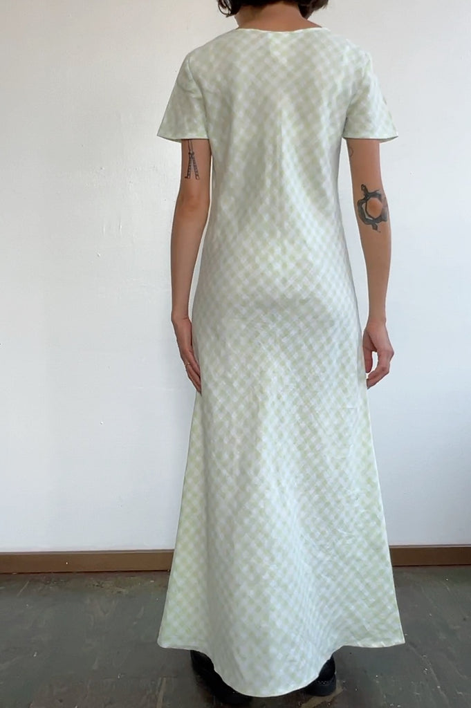 Late 90s/early 2000s key lime gingham picnic dress. Short sleeves with a maxi length and scoop neck. Bias cut so it has a little bit of give, but no stretch. Great vintage shape.