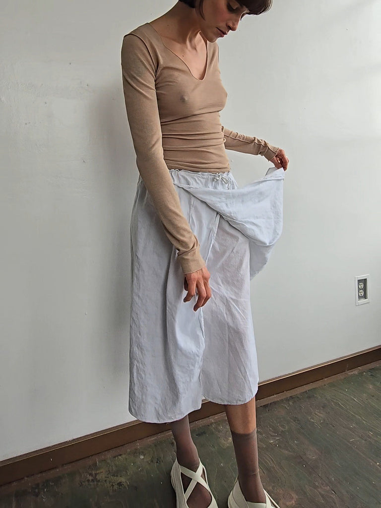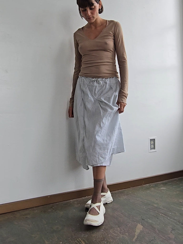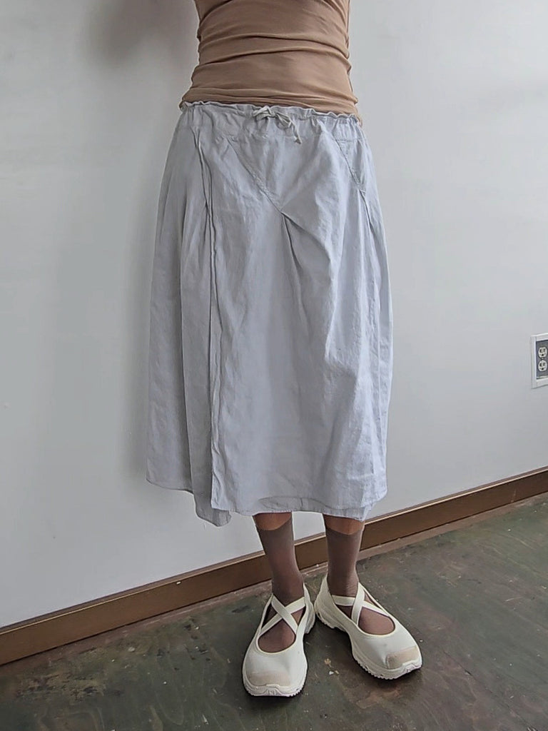 Vintage French made linen blend skirt. Drawstring waist with asymmetric stitching. Pale blue. Excellent condition,
