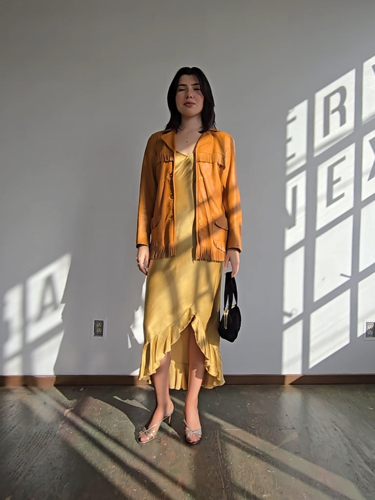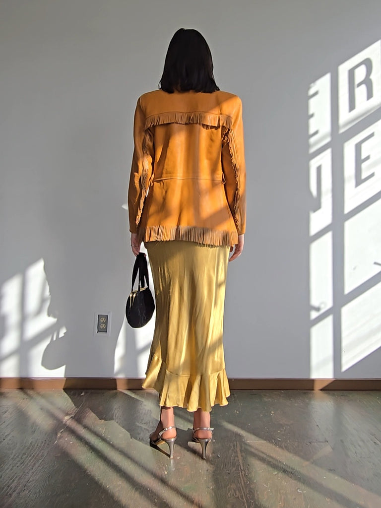 Vintage 1950s/60s softest amber leather fringed jacket with two front pockets. Lined. Missing belt but has belt loops. Great vintage condition.