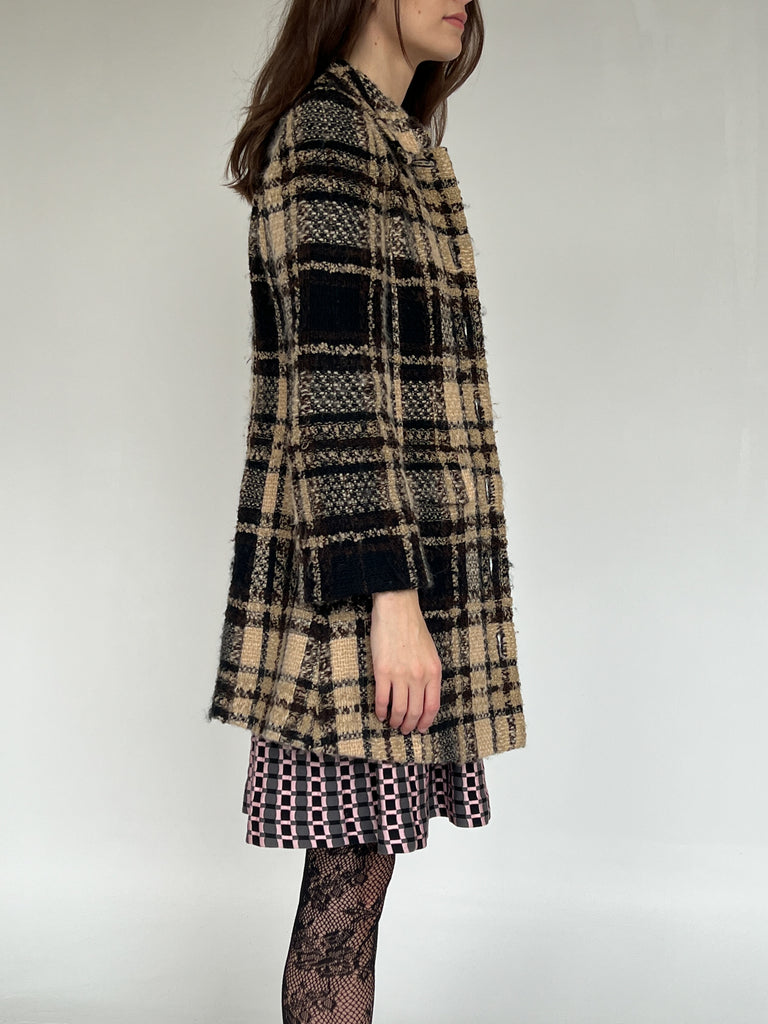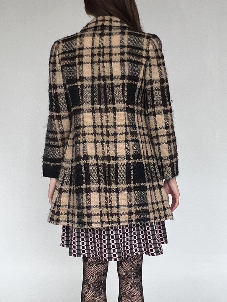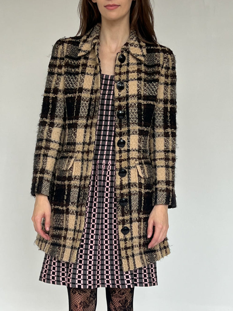 Vintage Miss Chloe soft brown and cream plaid wool jacket with black geometric buttons and double pockets. Fully lined and ultra soft. In excellent vintage shape. Marked french size 40.