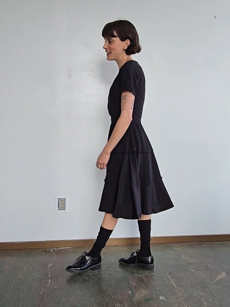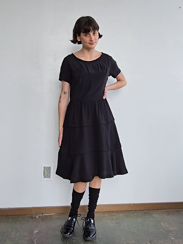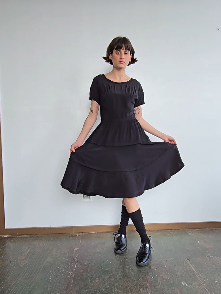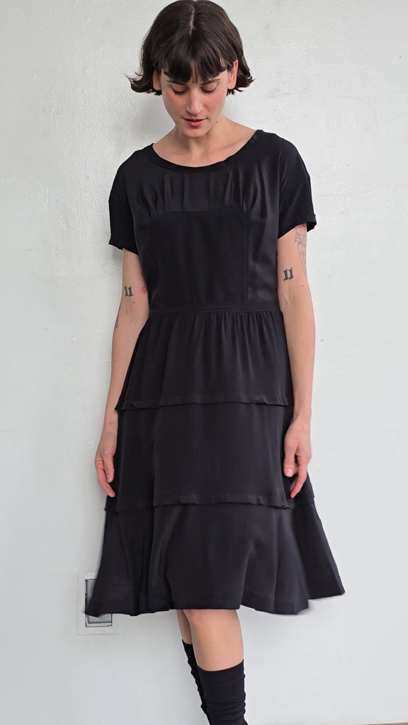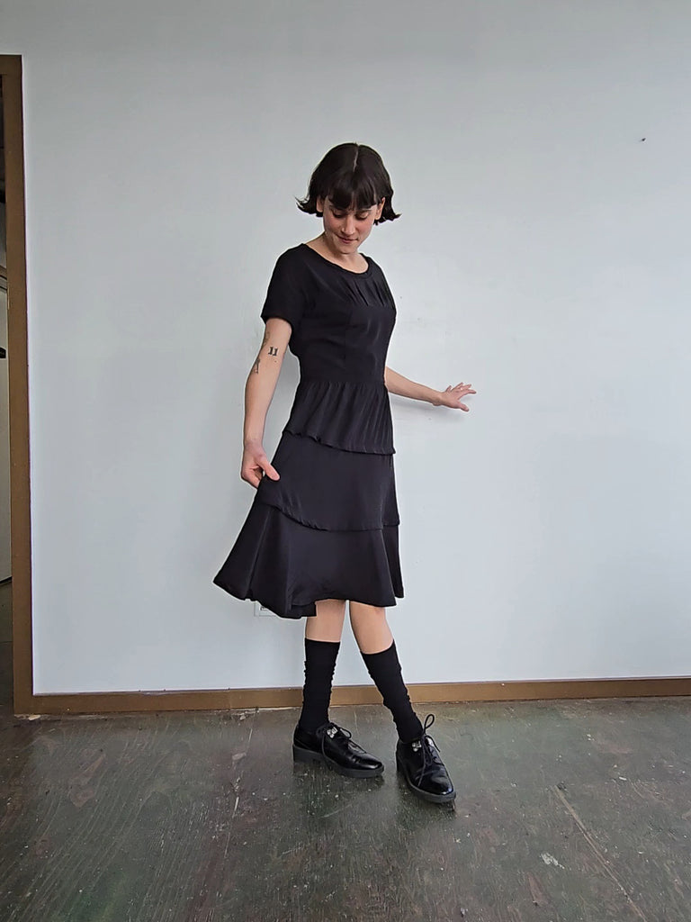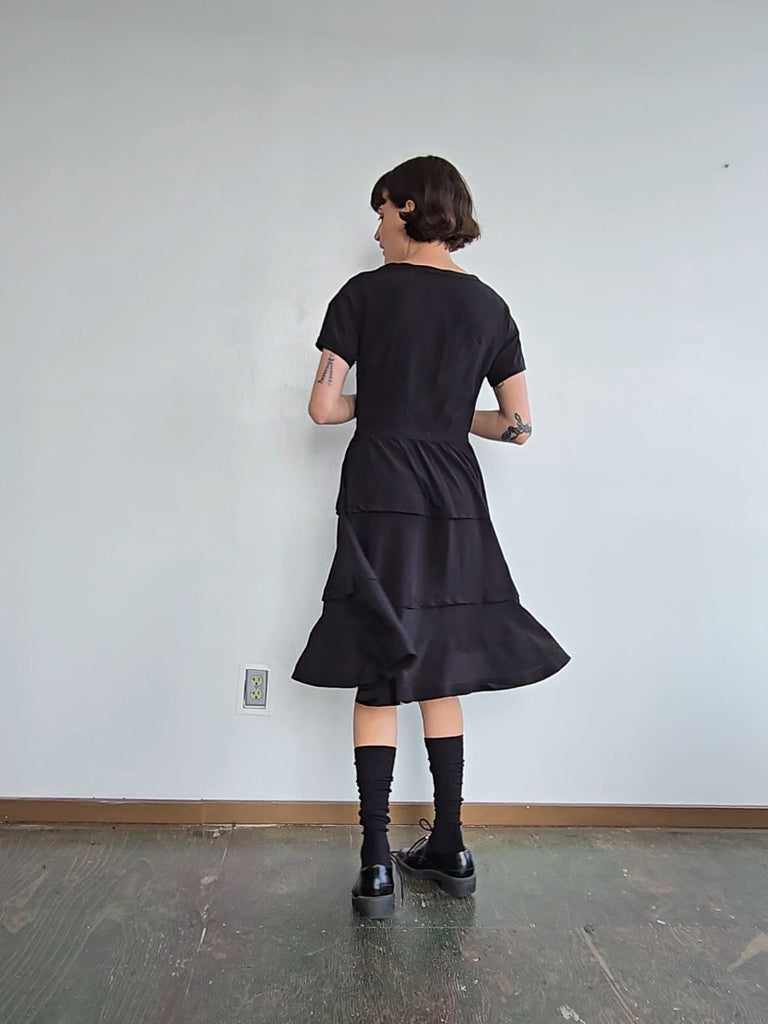 90s Italian made silk Miu Miu dress. Midi length with ruffled details along the skirt.