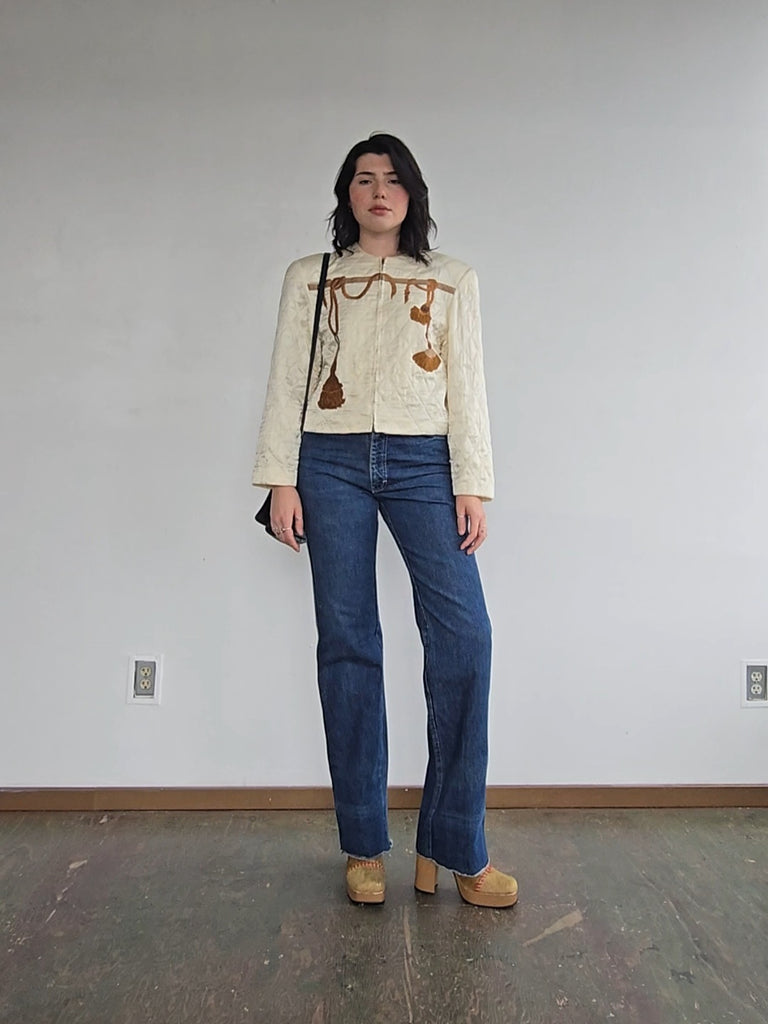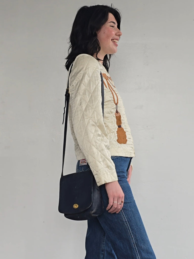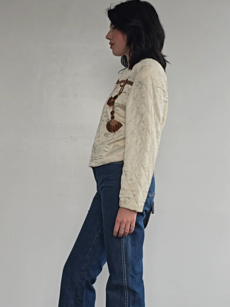 Super cute vintage 1990s Mondi cream quilted jacket with tassel applique + embroidery. Minor wear, great condition for age.Marked size 36.