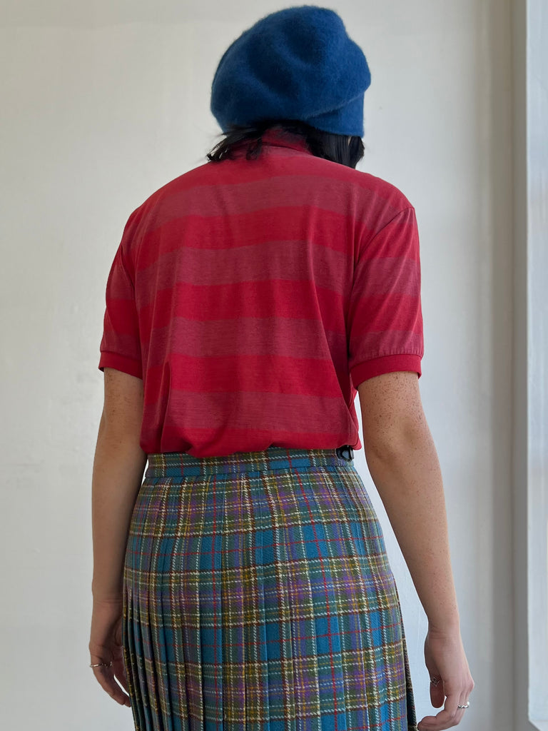 Cute tonal red striped polo style shirt with embroidered penguin at chest pocket. In good condition with a soft worn feel. Size M