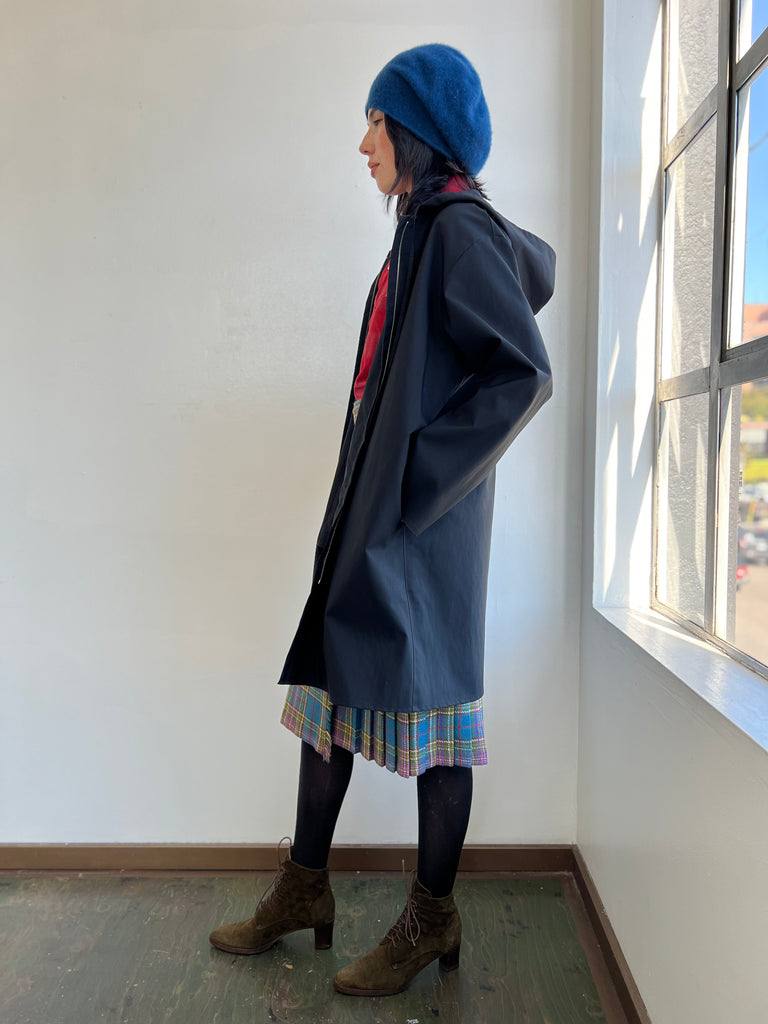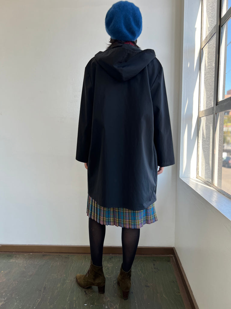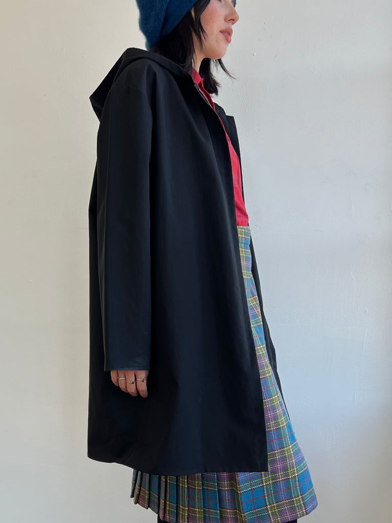 YeohLee black minimalist raincoat with a hidden zipper, two side pockets and a drawstring hood. In great condition. Made in New York