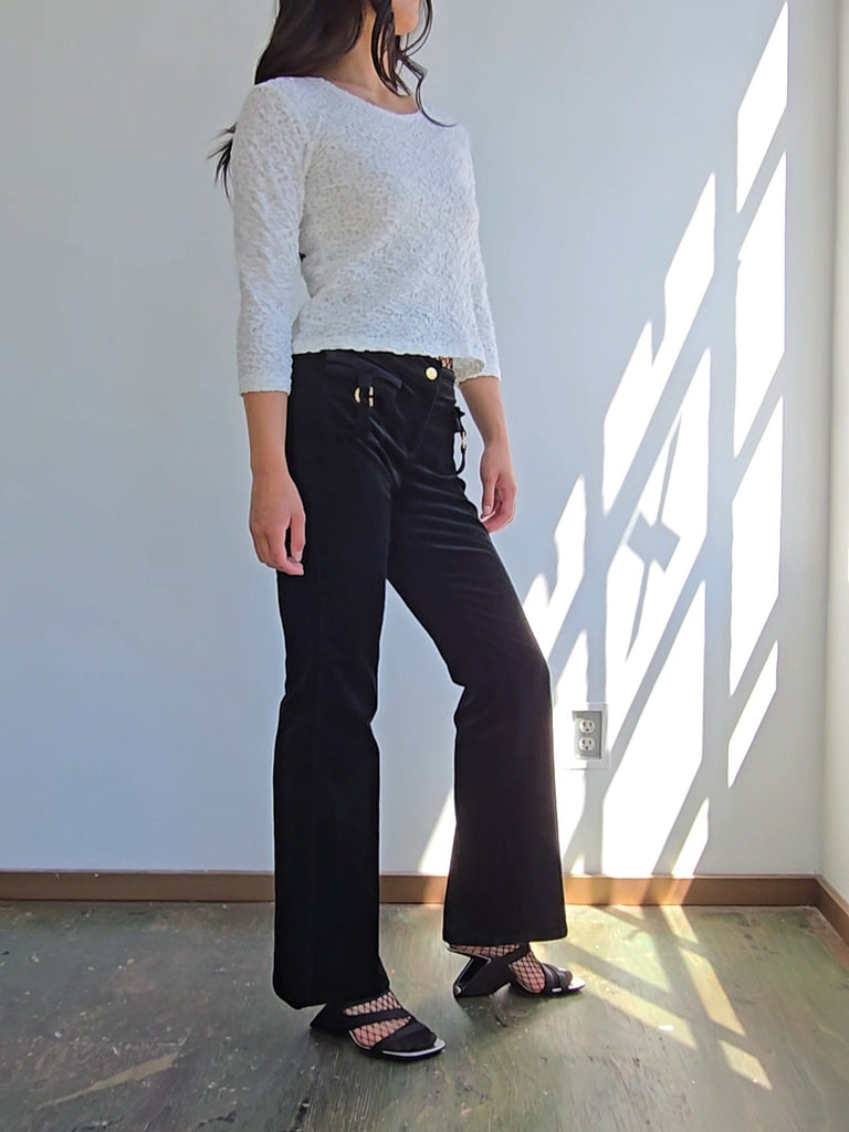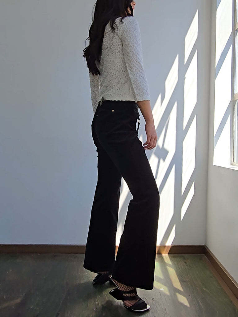 Italian-made Roberto Cavalli black corduroy lowrise flared trousers featuring two front pockets decorated with gold "C" buckles. In great condition. Marked size 44.