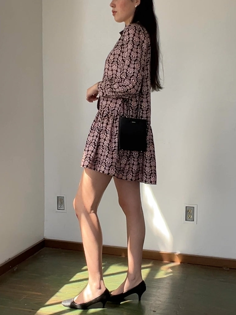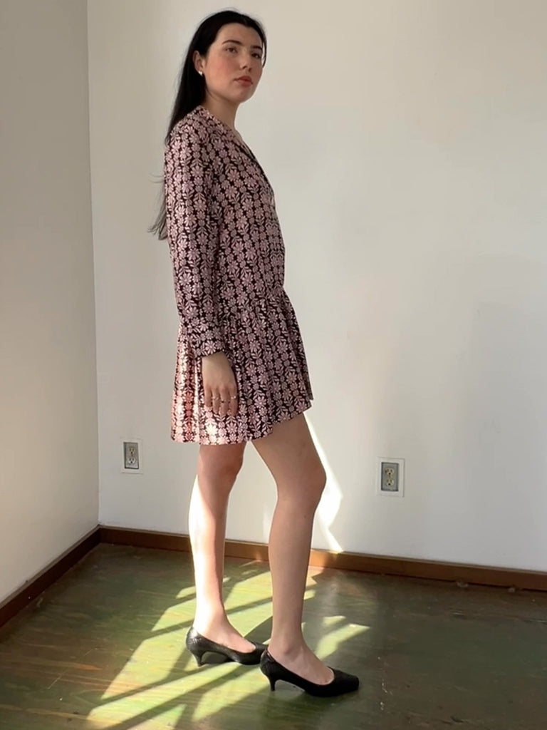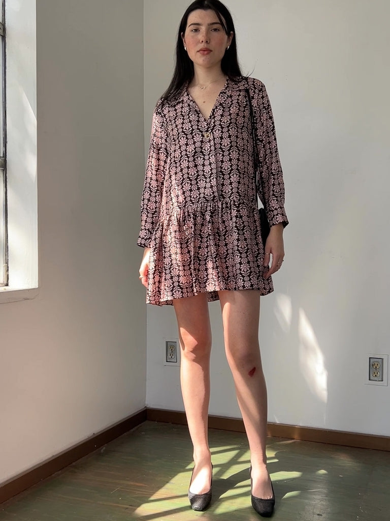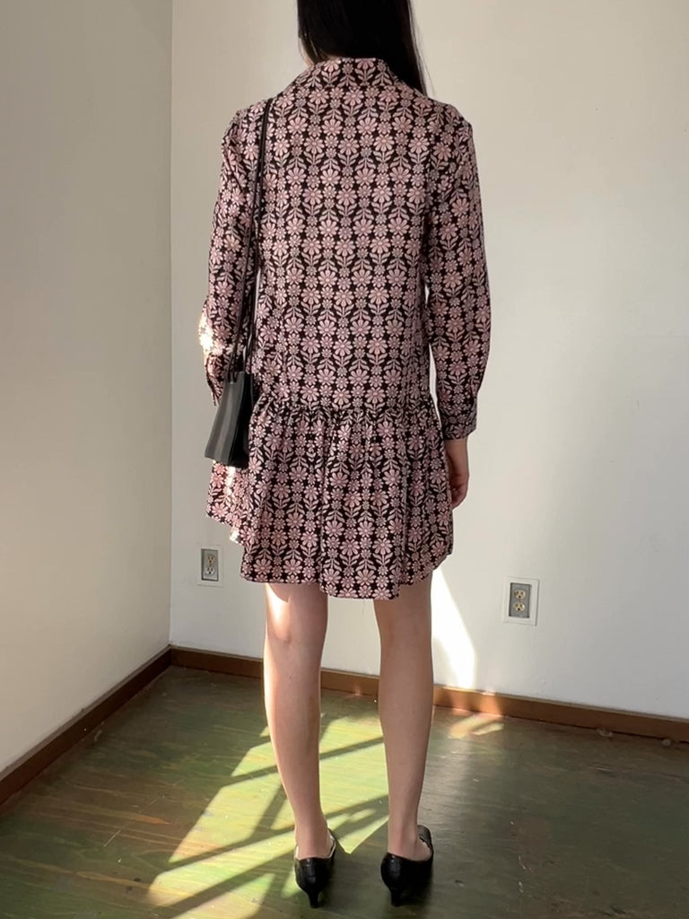 Sandro black and pink daisy print drop waist dress with a collar and a single gold button at the front.