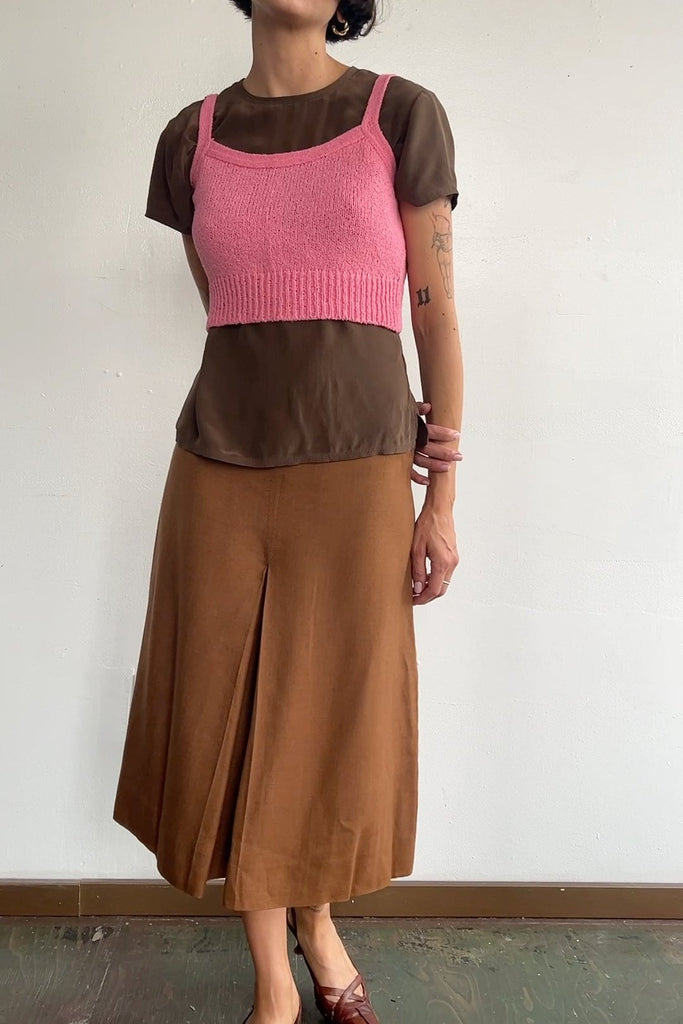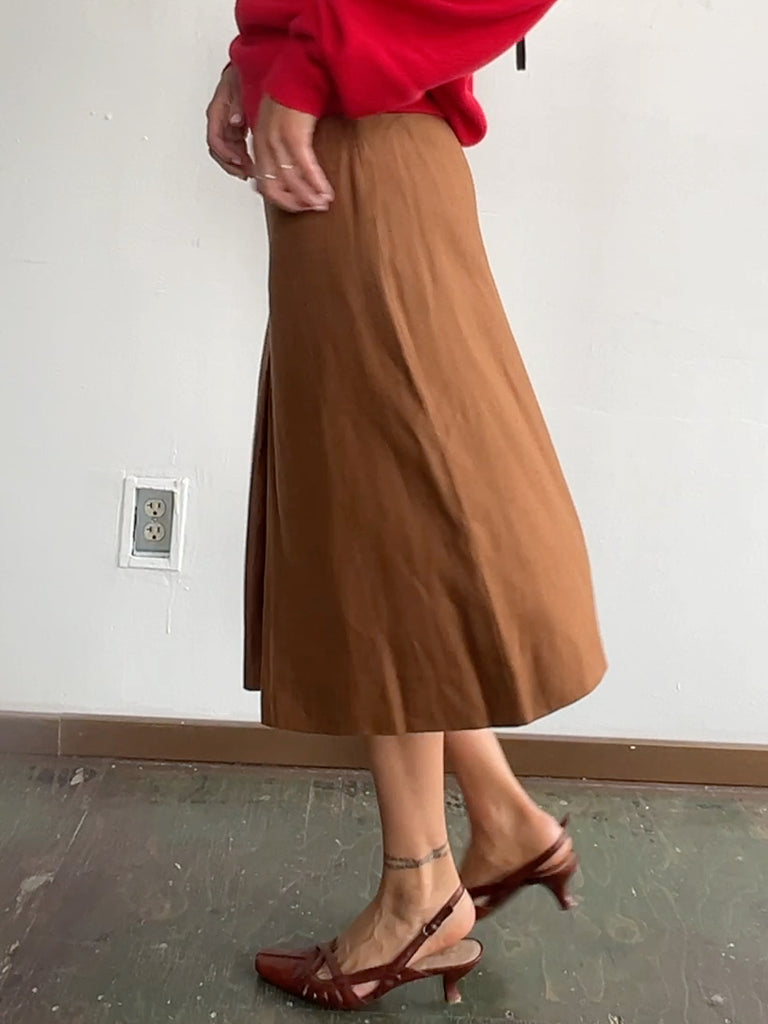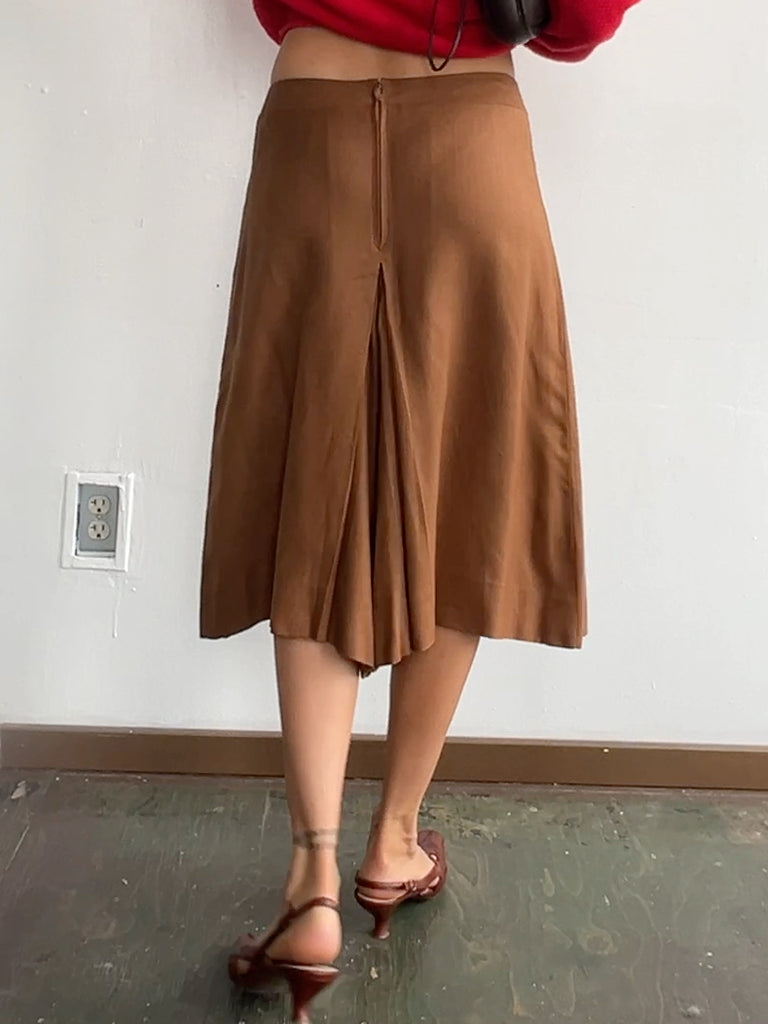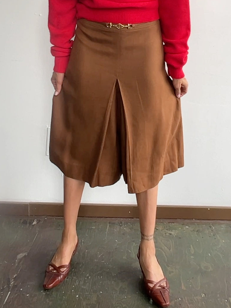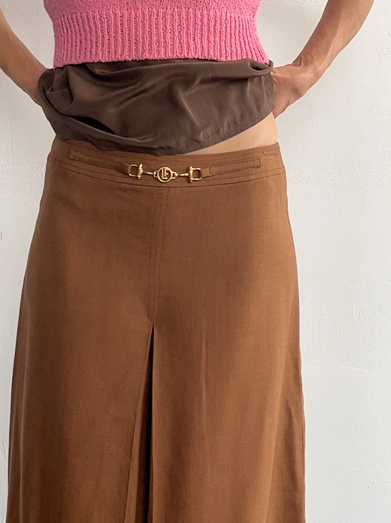 Vintage warm brown high waisted Italian designer split skirt. Side zip closure with gold hardware embellishment at front. Fully lined. Excellent vintage shape. Laura Biagiotti label.