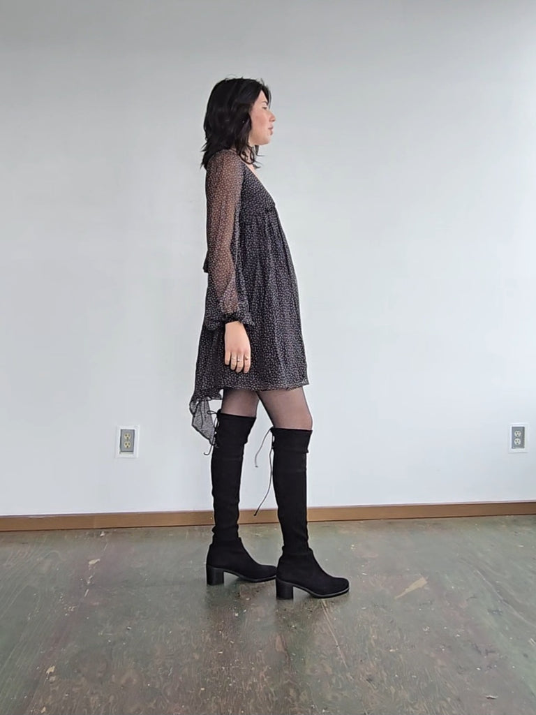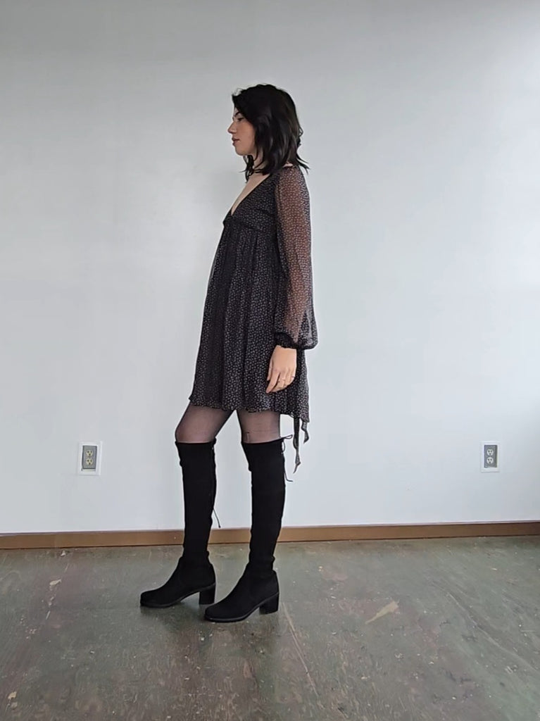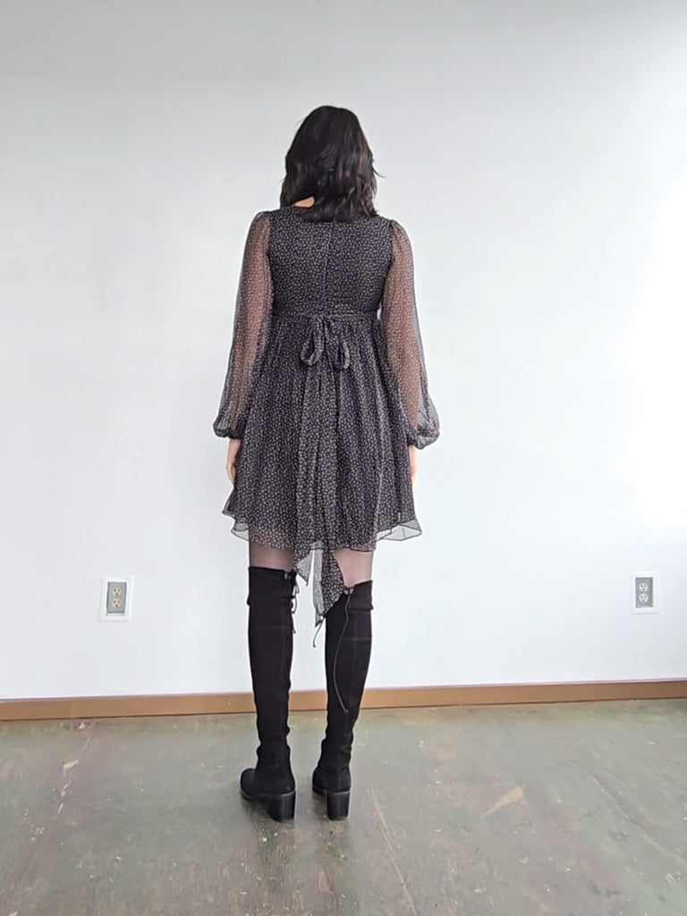 Vintage Jill Stuart 100% silk star print babydoll dress with full sheer sleeves. Fully lined, zip closure and tie at back. Excellent condition. Marked size 0.