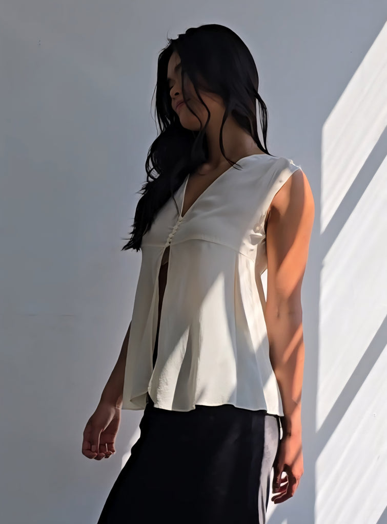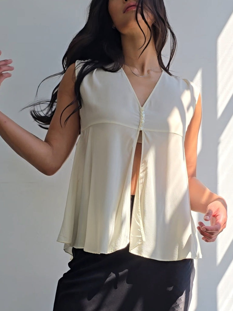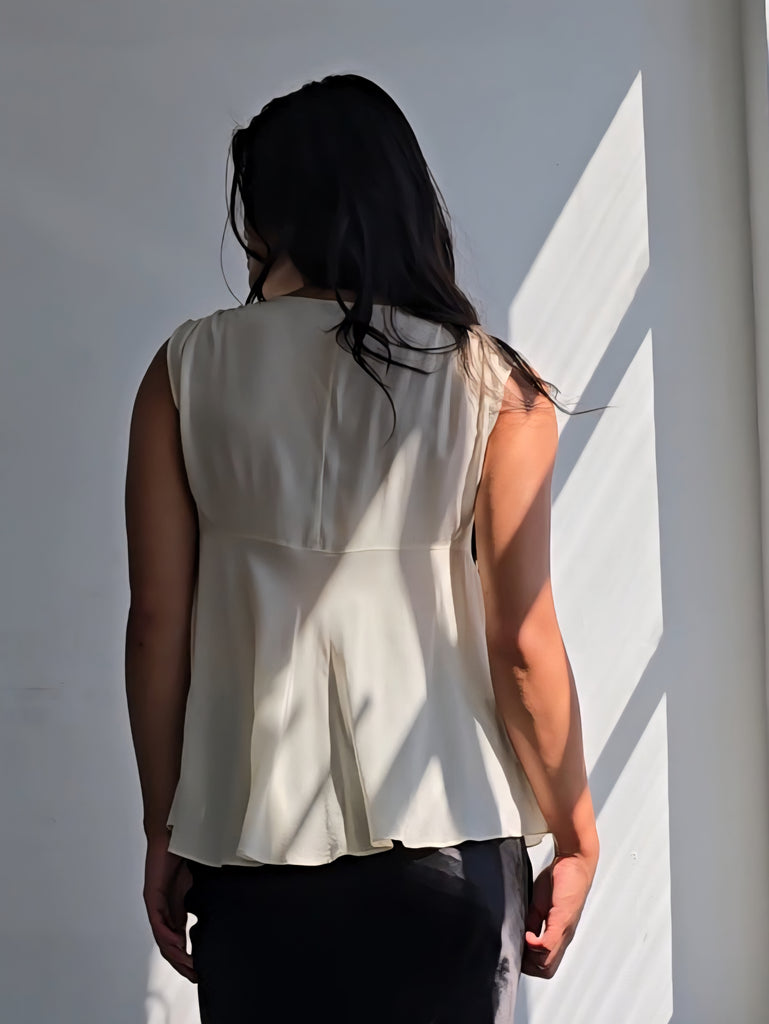 Strenesse shortsleeve silk blouse with opalescent buttons down the bust that flare open at the empire waist line. In great condition.