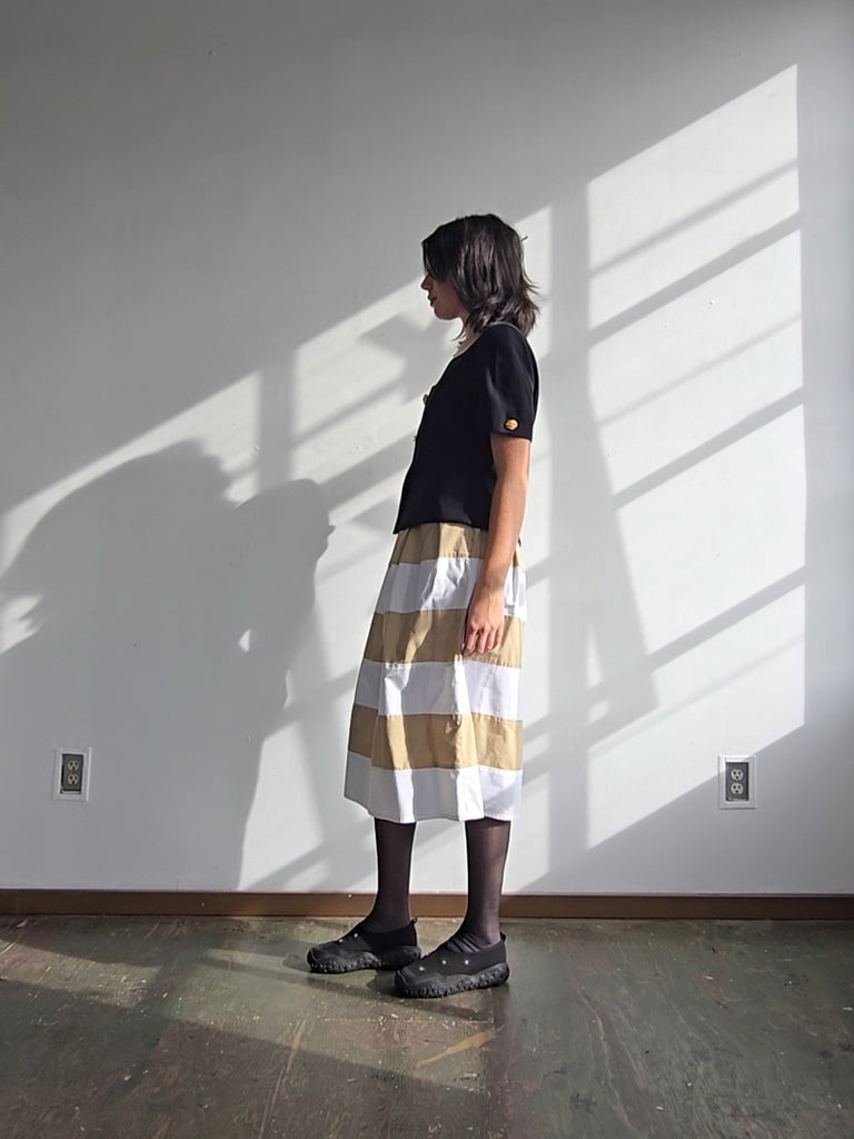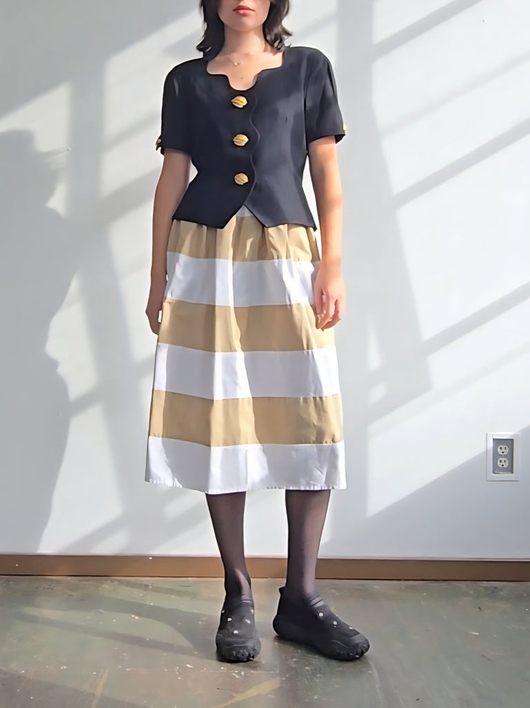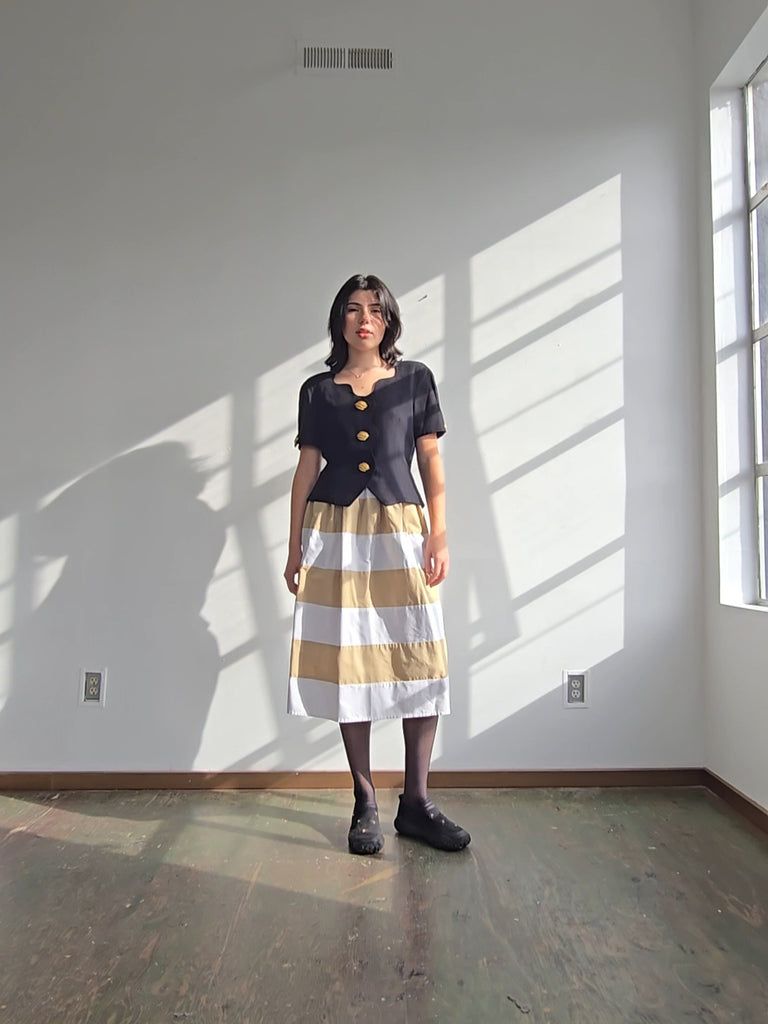 Gorgeous vintage Valentino crisp cotton striped skirt. Stripes are not printed on the fabric but are quilted together from different colors of fabric- a lovely Valentino detail! Excellent vintage condition.