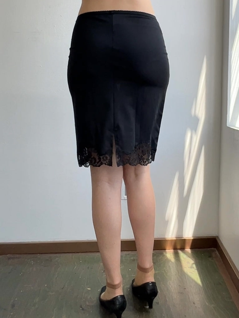 Vintage 60s USA-made Saks Fifth Avenue black slip skirt with lace detailing at the hemline that reveals two pale blue bows attached to the lining. In good condition.