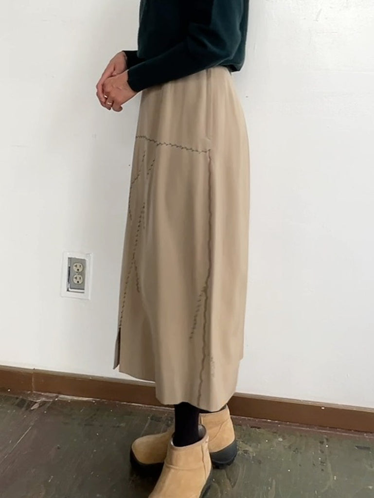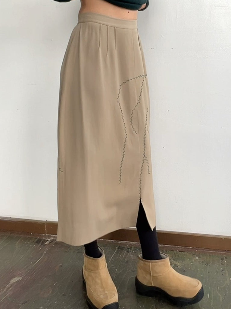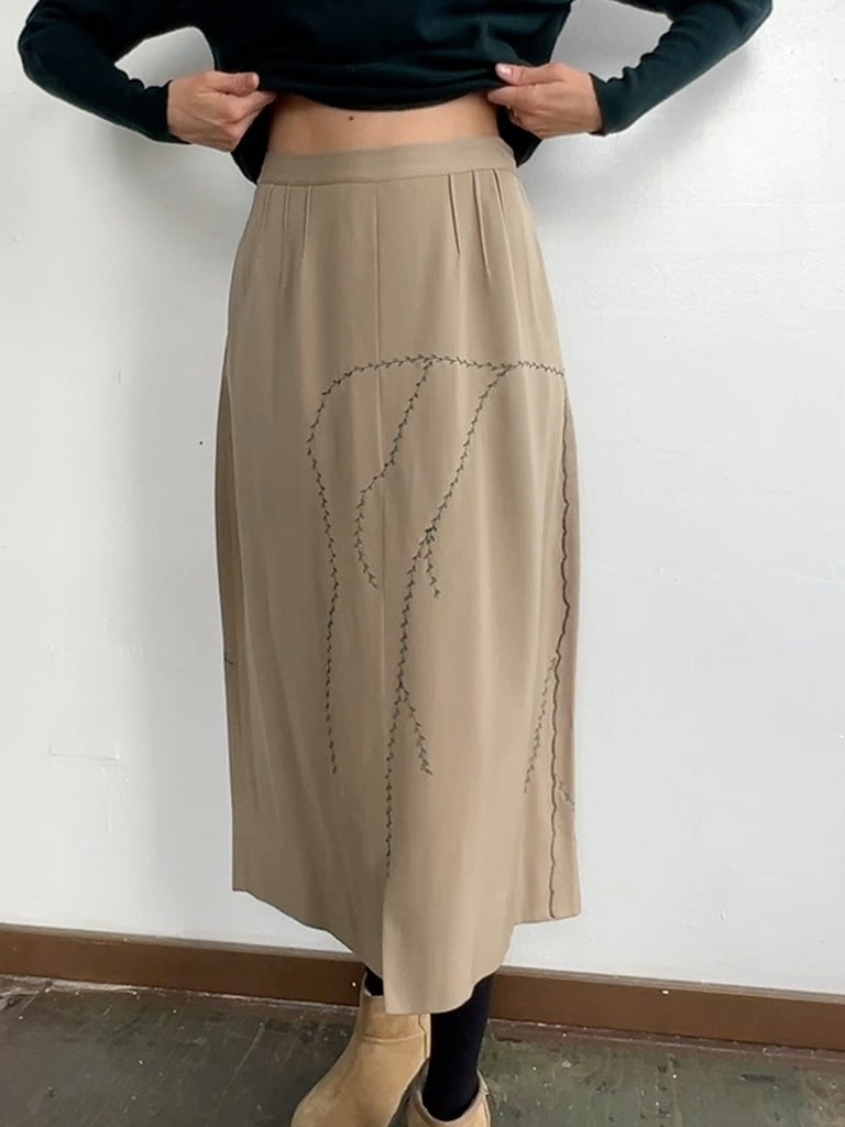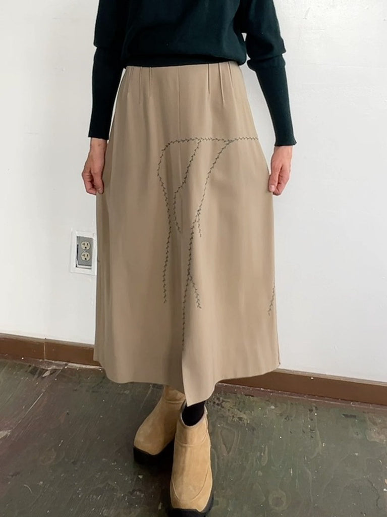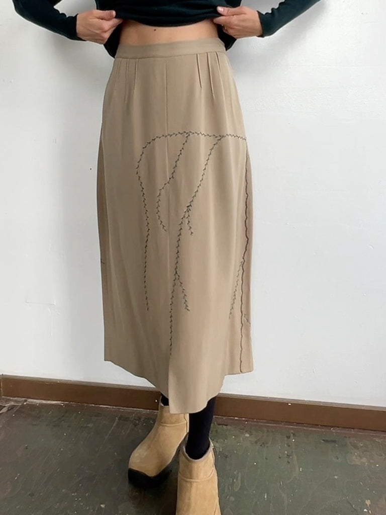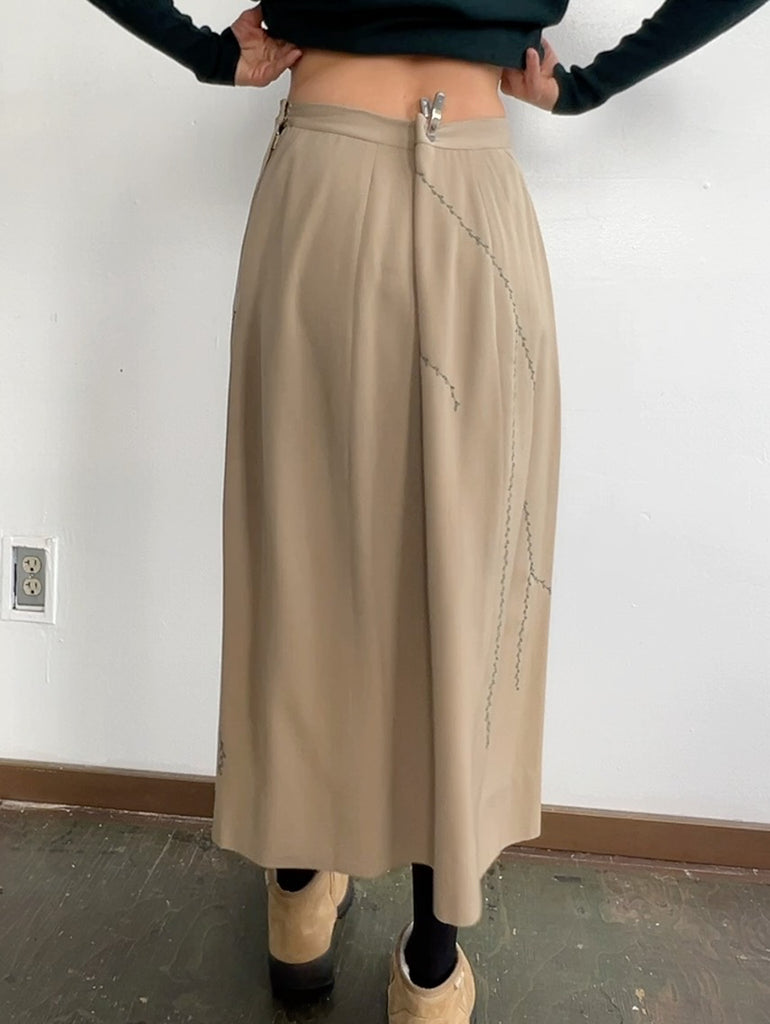 1940s vintage wool twill skirt. Knee length with a Conmar branded zipper up the side to close. Dark green leaf embroidery throughout.