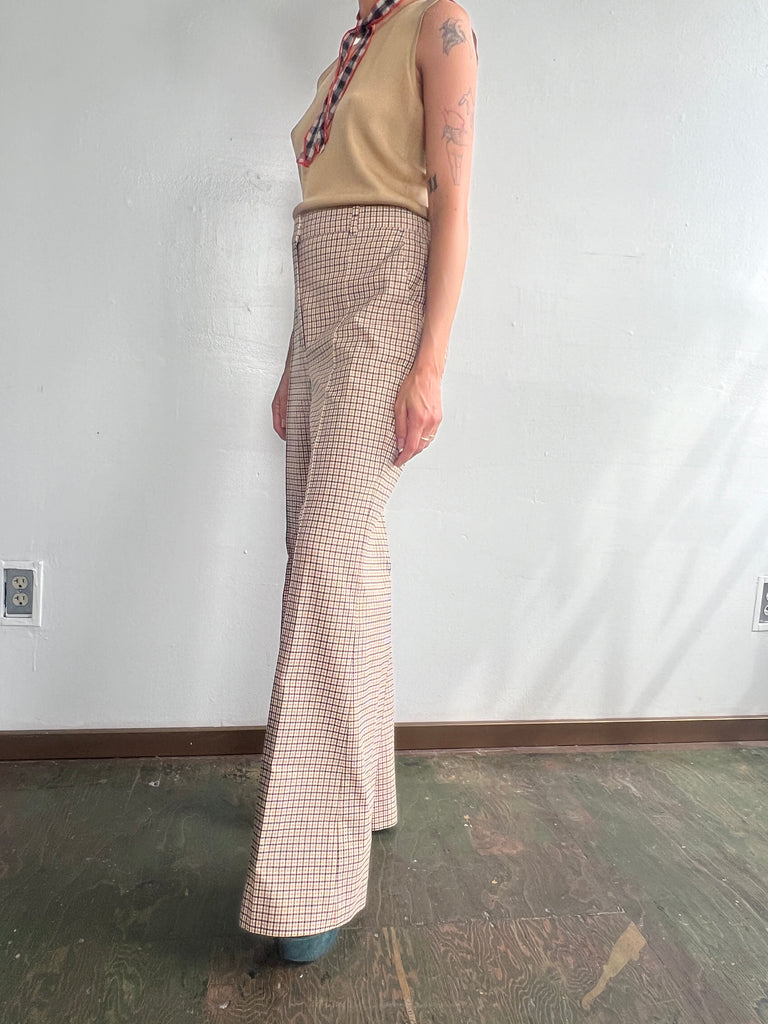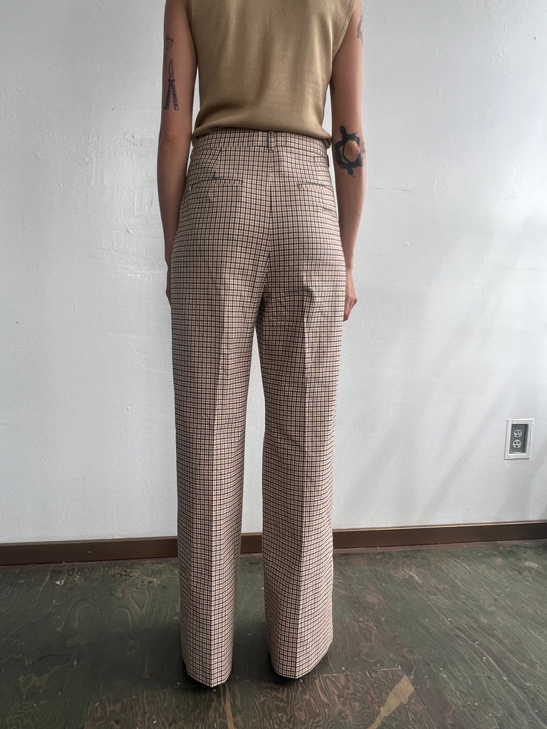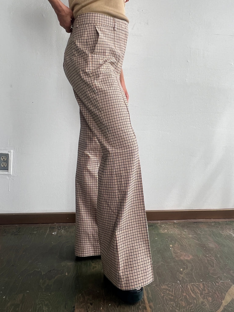 SportMax plaid trousers. White with brown toned pattern throughout. High waisted with a zipper fly and flared ankle. Great vintage shape.