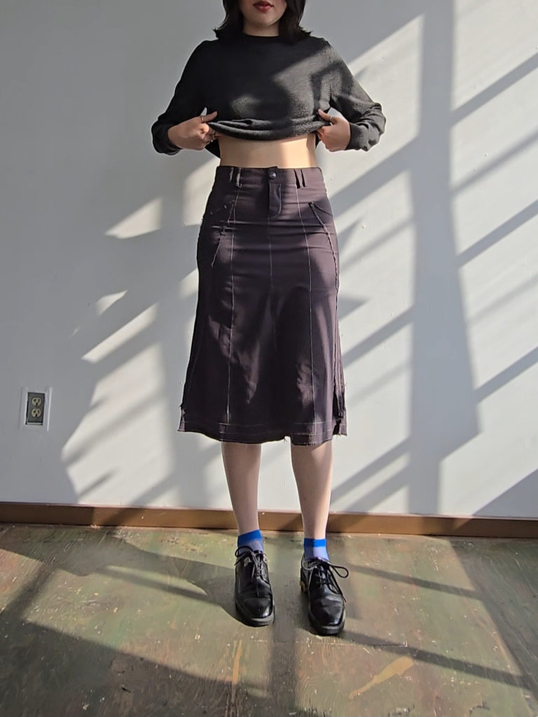 Y2K gray knee-length skirt with decorative seams and intentionally frayed raw edges along the pockets and hemline. Skirt has belt loops around the waist and closes with a zipper and button in the front. No marked size.