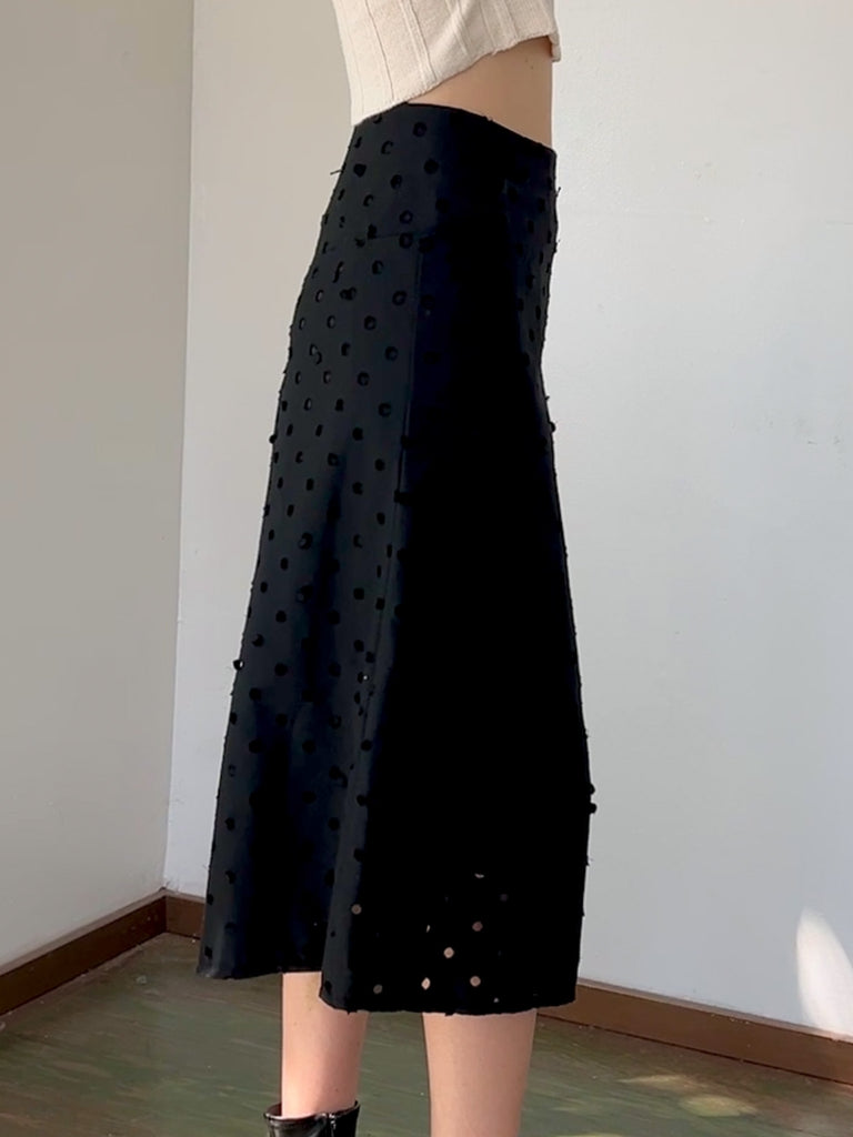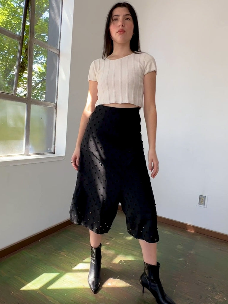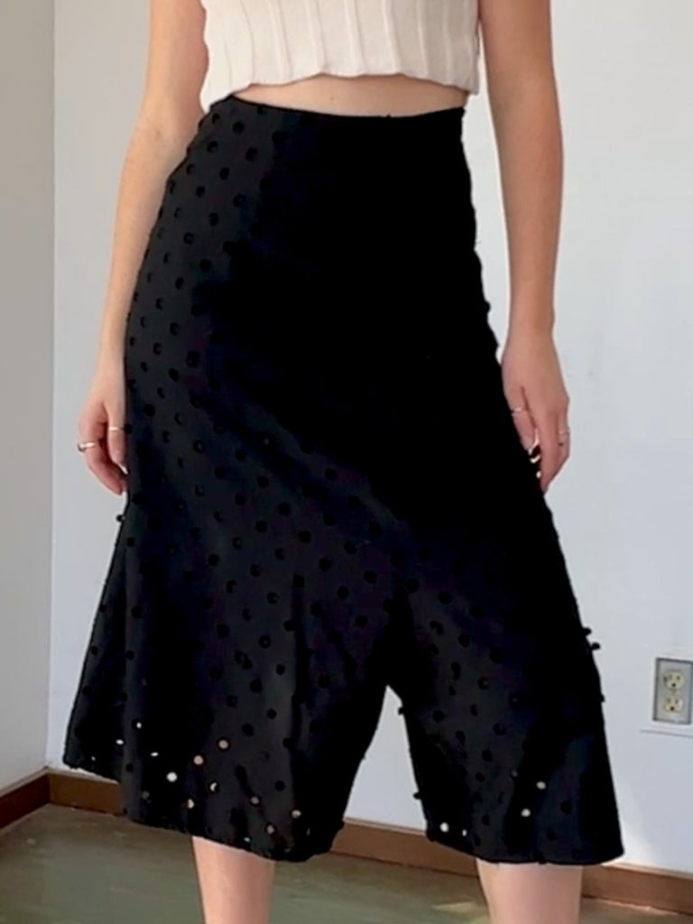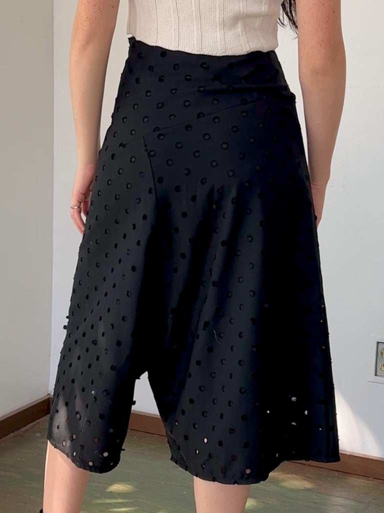 Yojhi Y's black skirt pants with polka-dot cut out detailing throughout. Single pocket on the left side. Fully lined with side zip closure. Leg holes are asymmetrical so that the right leg is wider than the left. In excellent condition with tags still attached.